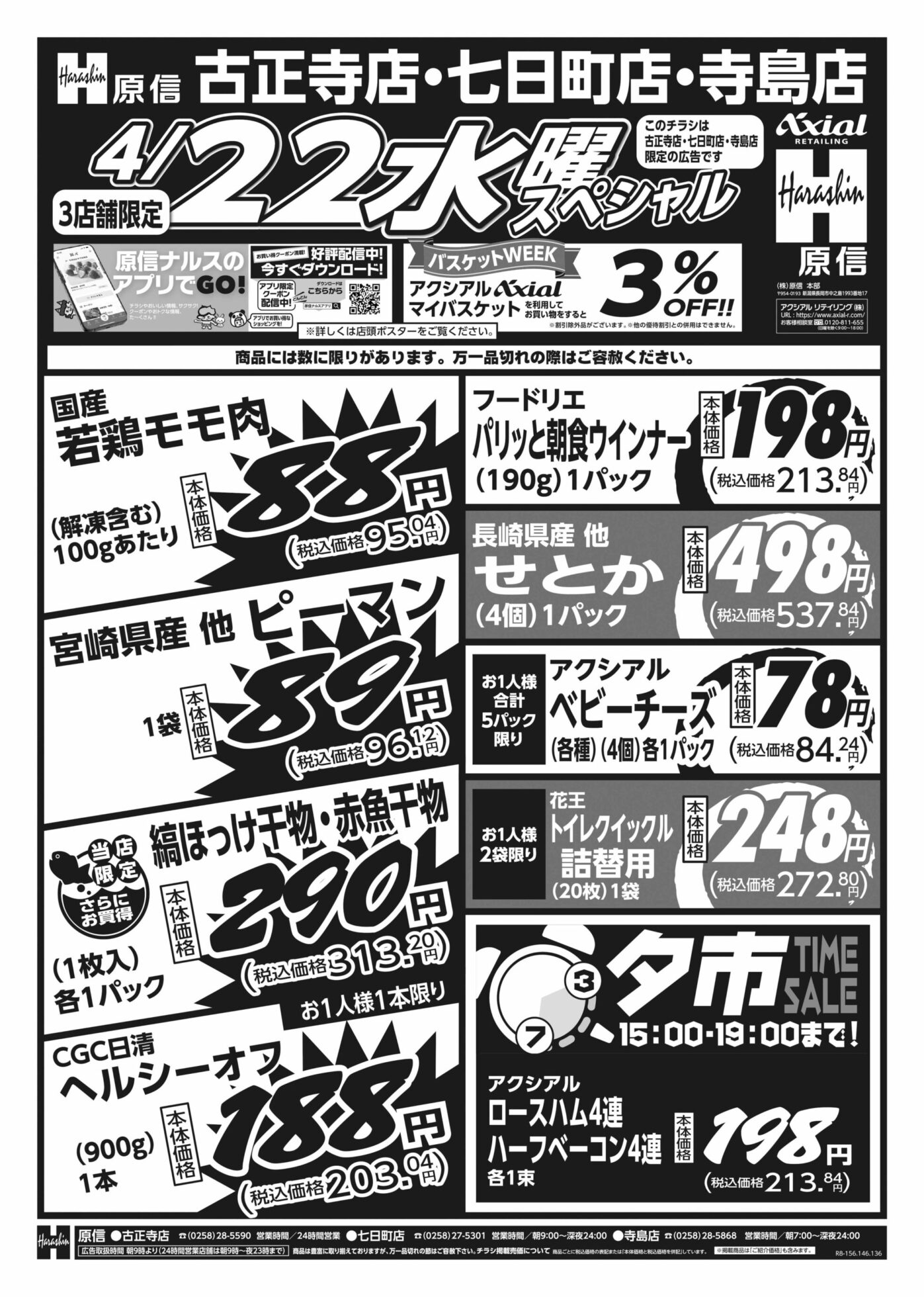 チラシをクリックで拡大できます 対象:古正寺店・七日町店・寺島店 インフォメーション 「原信ナルス」のホームページはこちらから https://www.harashinnarus.jp// SNSで記事を共有する セール・新店情報を見逃さない!