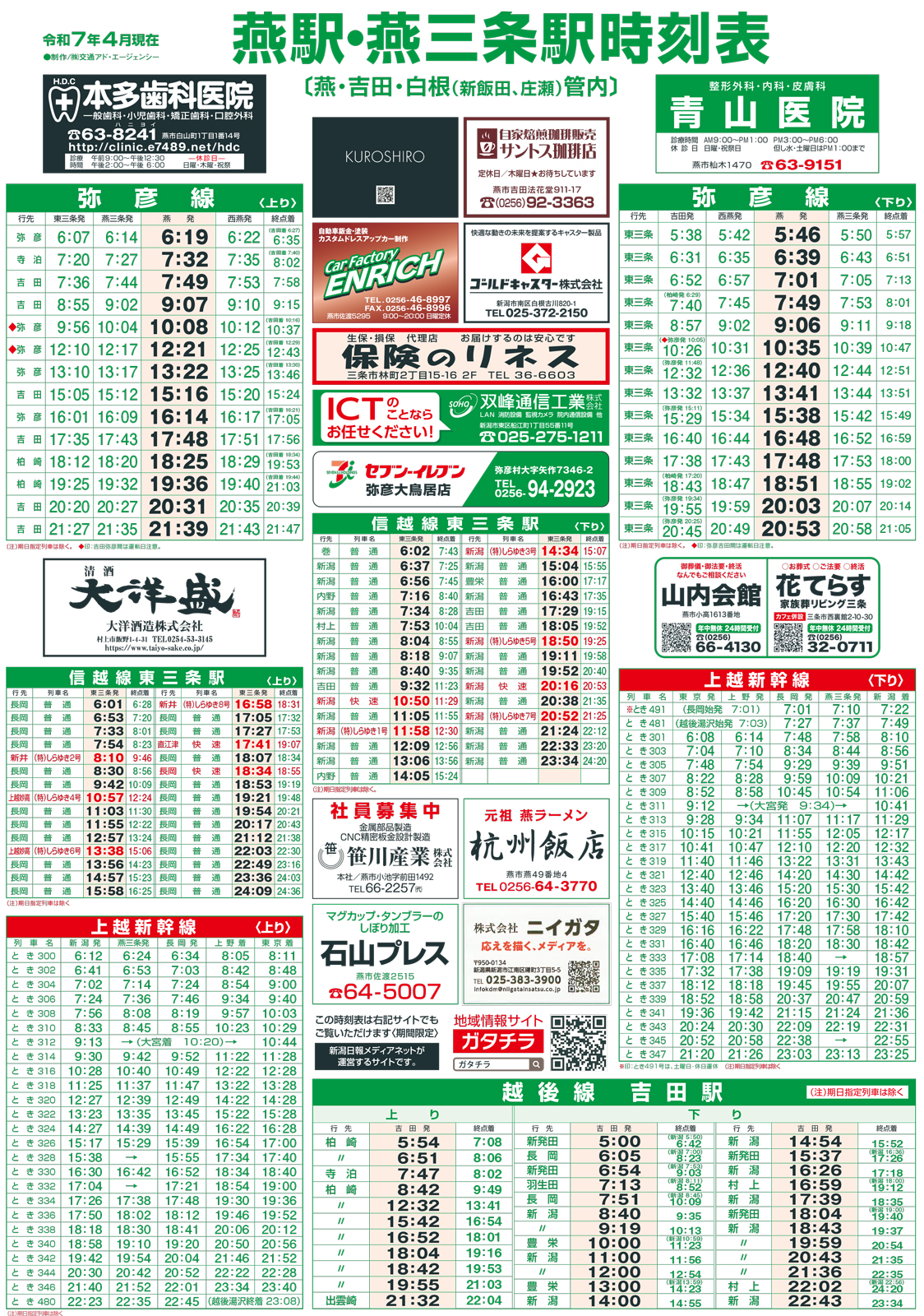 燕・燕三条駅発着時刻表 【燕・燕三条駅発着時刻表チラシ】燕地区 掲載期間:2025年4月10日〜2025年12月31日 下越 時刻表 画像をクリックして拡大 prev next 関連 乗り遅れないように、しっかりチェックね!