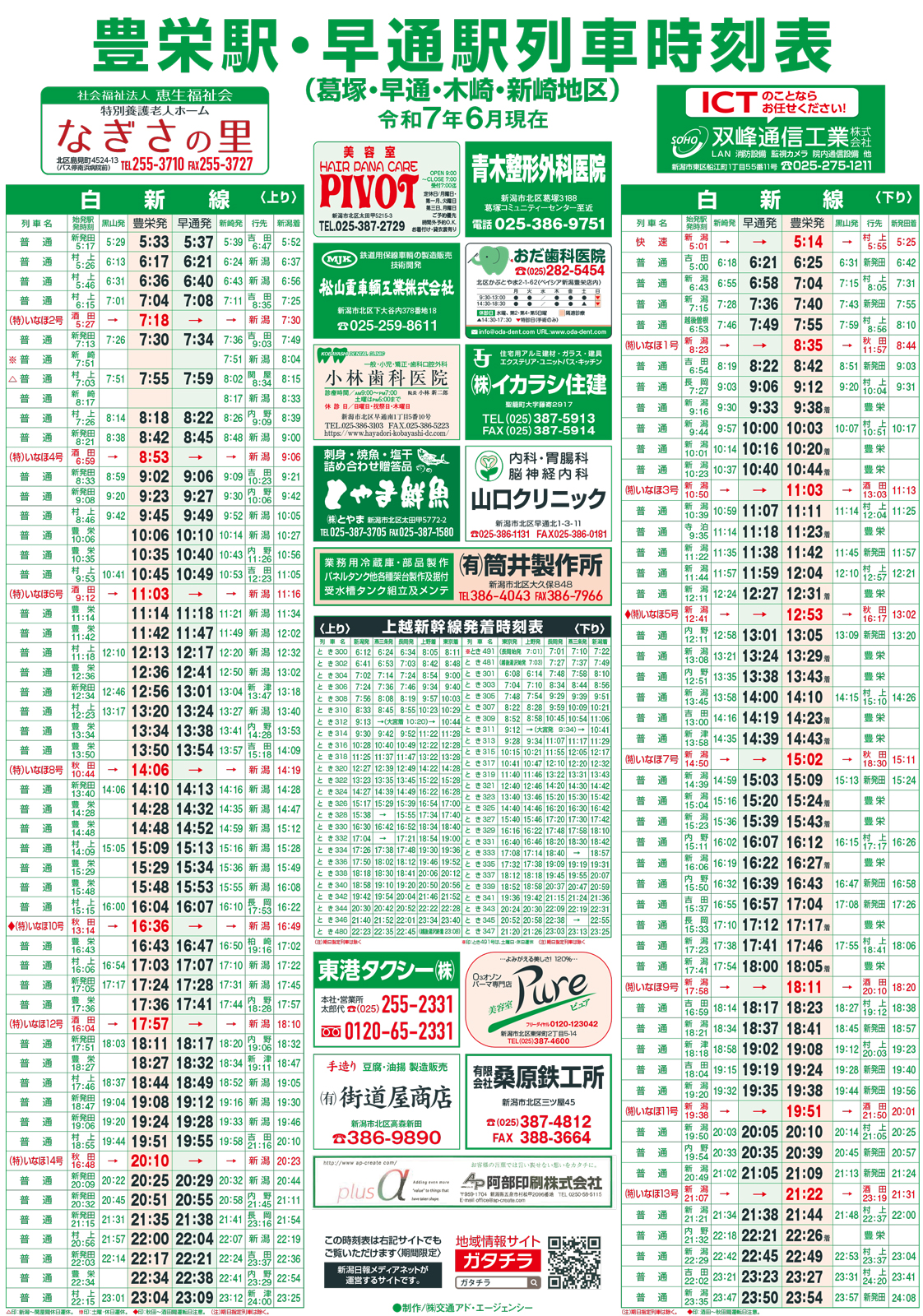 豊栄・早通駅発着時刻表 【豊栄・早通駅発着時刻表チラシ】豊栄地区 掲載期間:2025年6月13日〜2025年12月31日 新潟市 時刻表 画像をクリックして拡大 prev next 関連 よく確認しておこう!