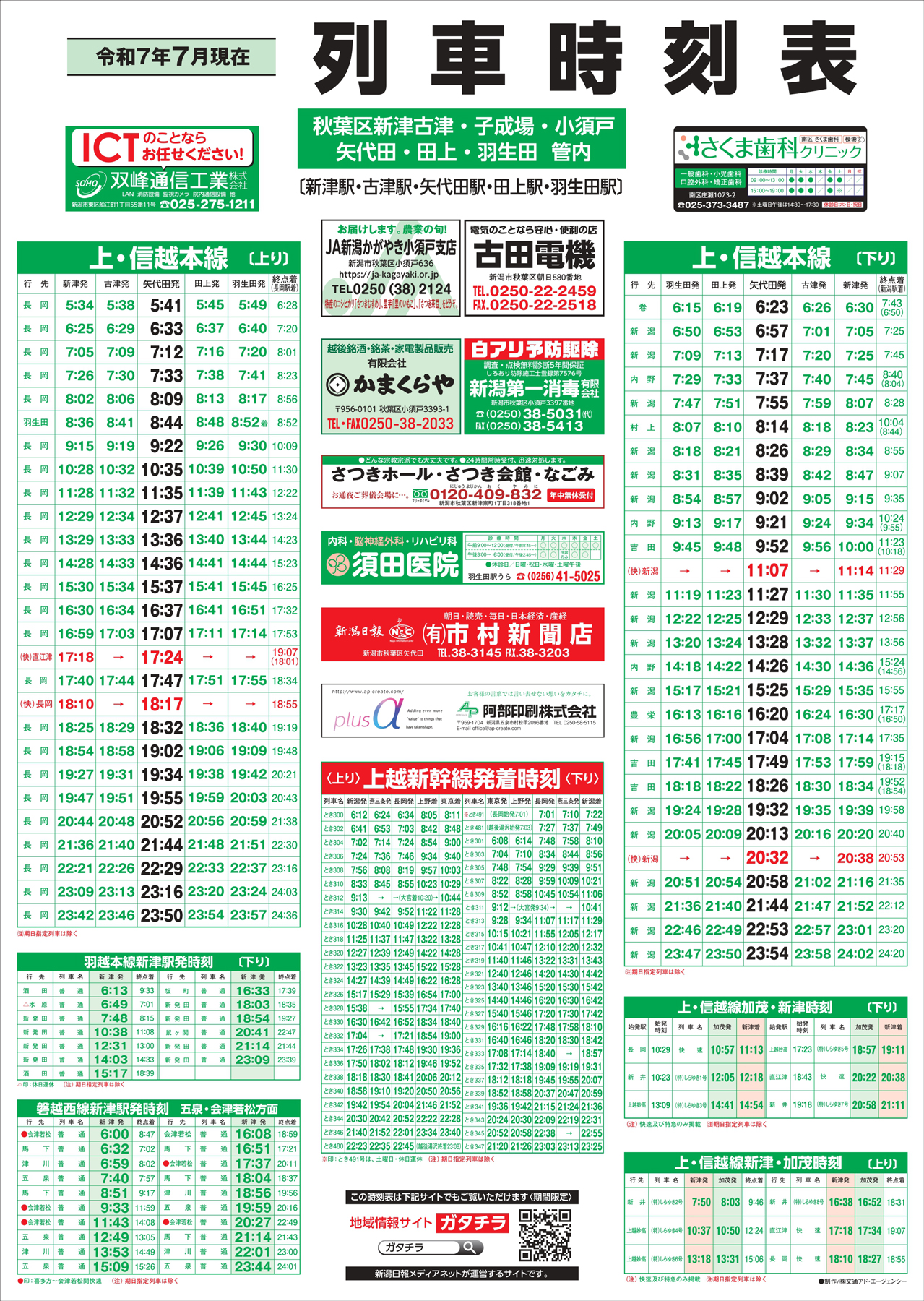 新津・古津・矢代田・田上・羽生田駅発着時刻表 【新津・古津・矢代田・田上・羽生田駅発着時刻表チラシ】小須戸地区 掲載期間:2025年8月1日〜2025年12月31日 新潟市 時刻表 画像をクリックして拡大 prev next 関連 乗り遅れないように、しっかりチェックよ!