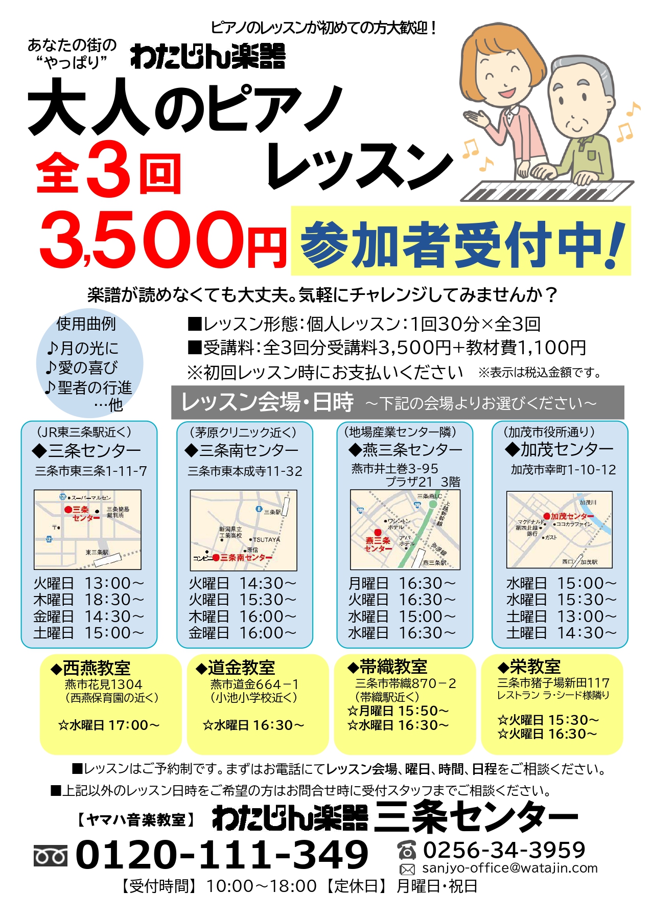 わたじん楽器三条センター 【わたじん楽器三条センターチラシ】大人のピアノレッスン全3回3,500円 掲載期間:2025年8月28日〜2025年12月26日 中越下越 生活サービス 画像をクリックして拡大 prev next 関連 私もピアノ弾いてみたいわ~♪