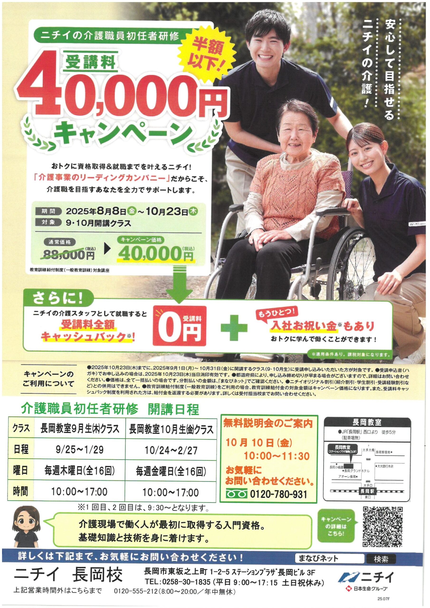 ニチイ学館長岡支店 【ニチイ学館長岡支店 長岡教室チラシ】受講料全額キャッシュバック! 掲載期間:2025年9月13日〜2026年2月27日 中越 求人 画像をクリックして拡大 prev next 関連 受講料全額キャッシュバック嬉しいわね♪