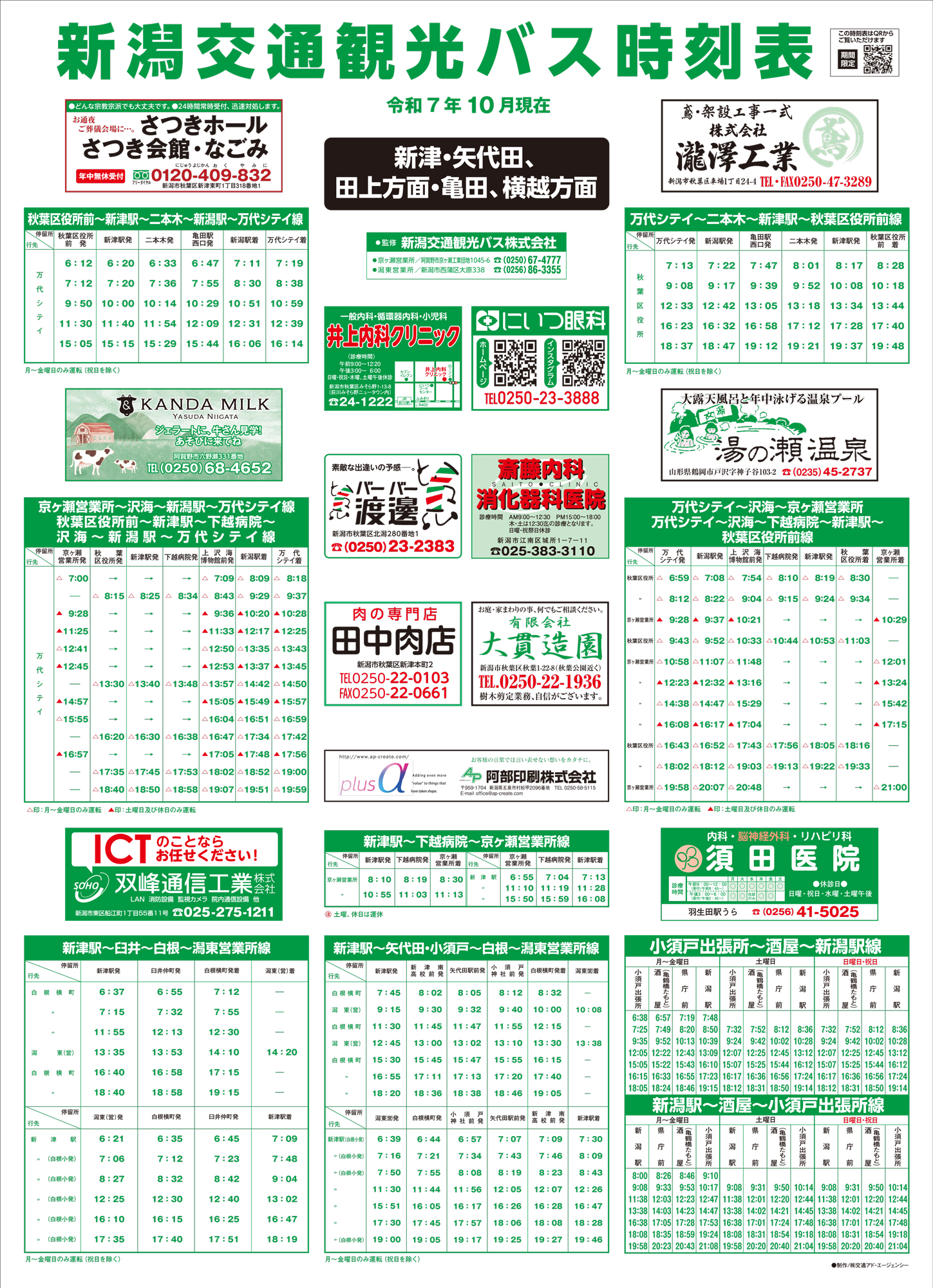 新潟交通観光バス・列車時刻表 【新潟交通観光バス・列車時刻表チラシ】新津地区 掲載期間:2025年10月19日〜2025年12月31日 下越 時刻表 画像をクリックして拡大 prev next 関連 乗り遅れないように、しっかりチェックよ!