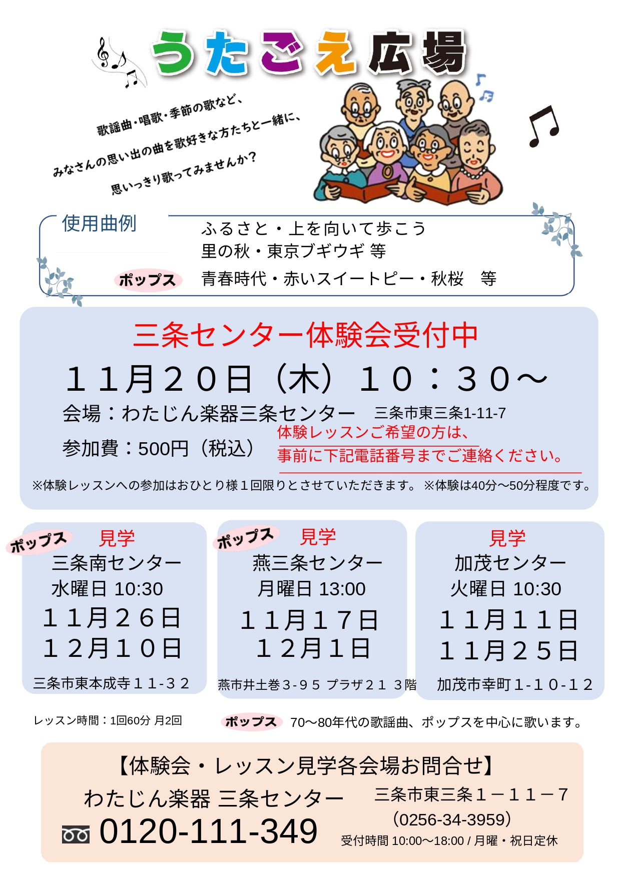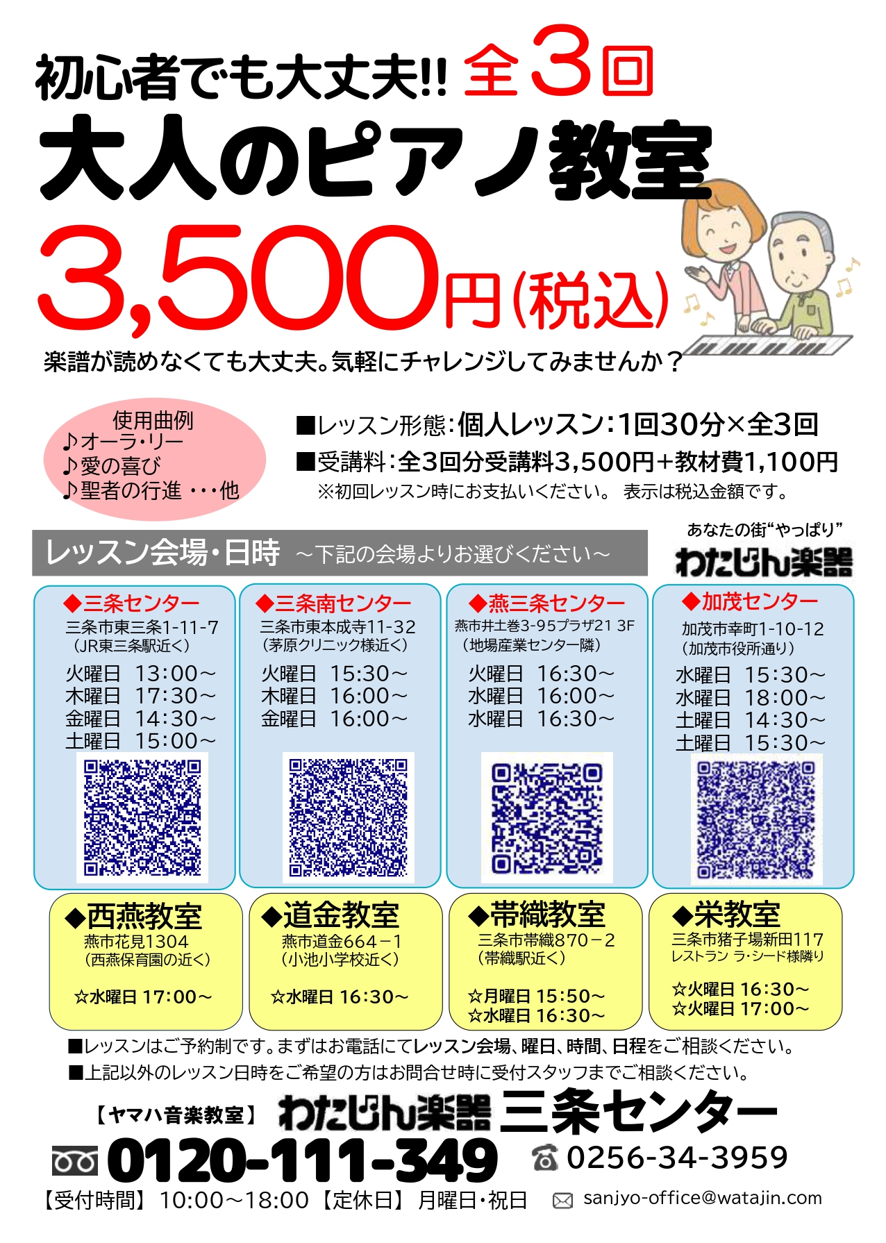 わたじん楽器三条センター 【わたじん楽器三条センターチラシ】大人のピアノ教室/うたごえ広場 掲載期間:2025年11月4日〜2025年12月10日 中越下越 生活サービス 画像をクリックして拡大 prev next 関連 楽譜が読めなくても大丈夫ですって! 私も始めようかしら?