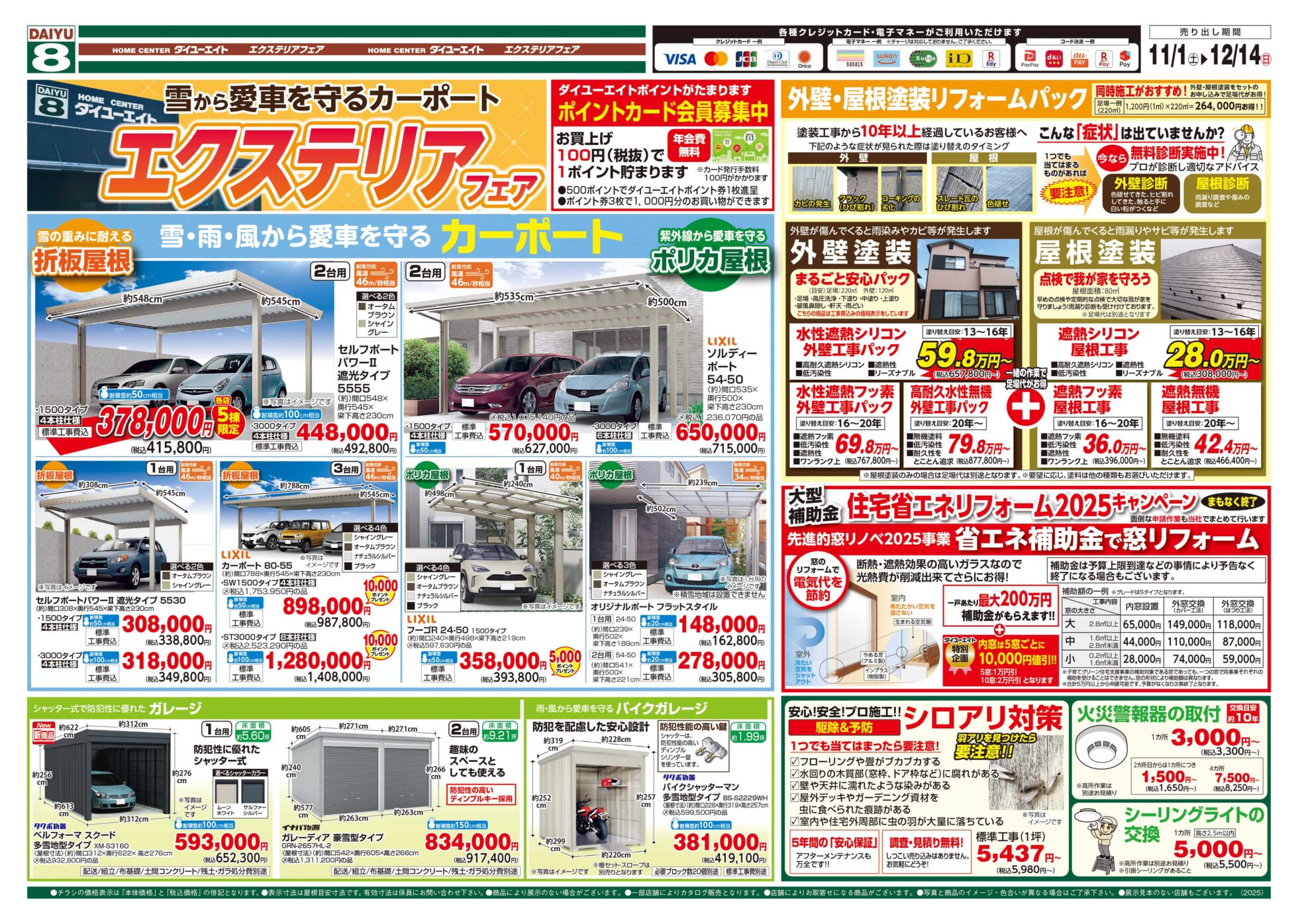 【ダイユーエイトチラシ】雪から愛車を守るカーポート エクステリアフェア