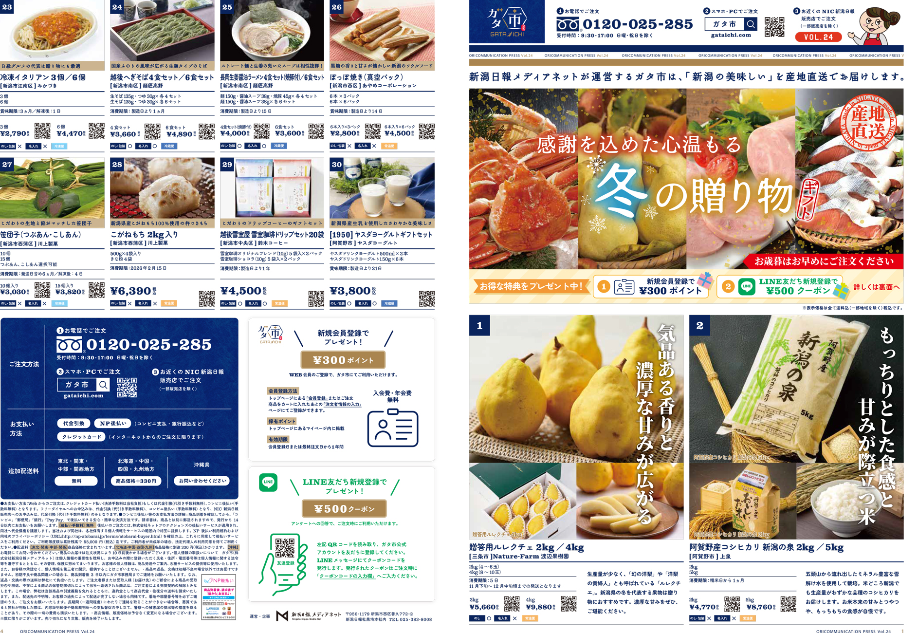 ガタ市 【ガタ市チラシ】冬の贈り物 掲載期間:2025年11月15日〜2025年12月31日 上越中越新潟市下越佐渡 通信販売グルメ 画像をクリックして拡大 prev next セール・新店情報を見逃さない! ガタチラをホーム画面に追加して、 最新情報をすぐチェック▶追加方法はかんたん♪ 関連 新潟のおいしいものが沢山掲載されているわ! どれを贈っても喜ばれそうね!! 送料込みでこの価格ですって!!!