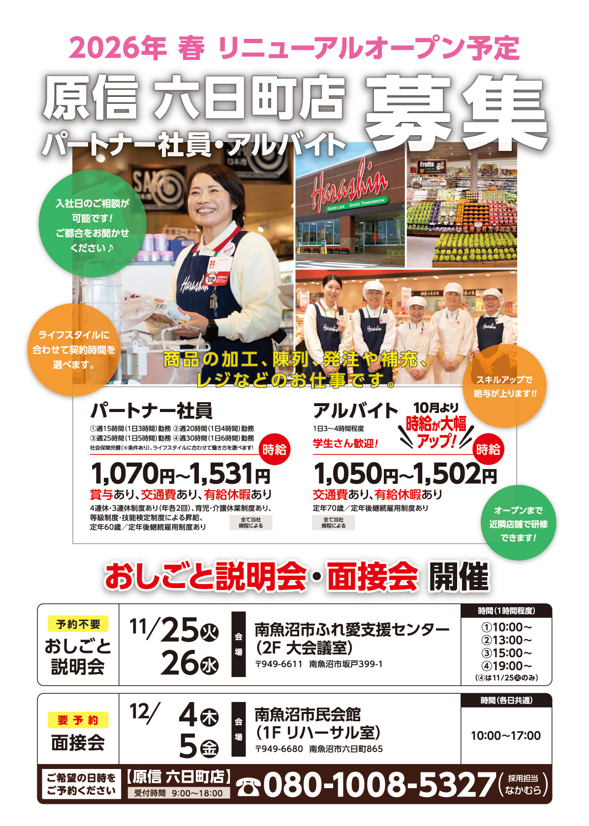原信ナルス六日町店 【原信ナルス六日町店チラシ】パートナー社員・アルバイト 募集 掲載期間:2025年11月18日〜2025年12月5日 中越 スーパー原信ナルス求人 画像をクリックして拡大 prev next 対象:原信六日町店のみ セール・新店情報を見逃さない! ガタチラをホーム画面に追加して、 最新情報をすぐチェック▶追加方法はかんたん♪ 関連 とっても働きやすそうね!