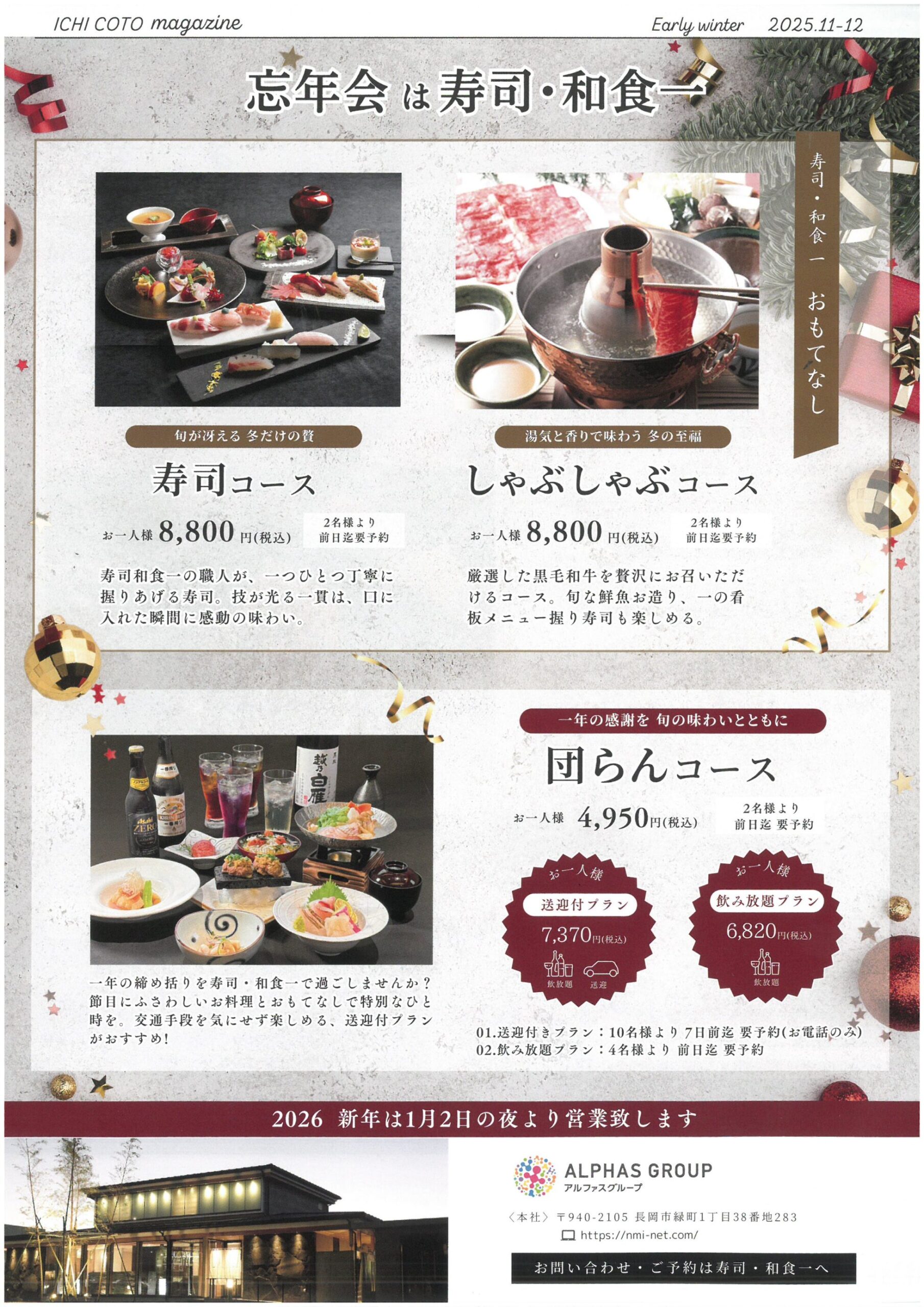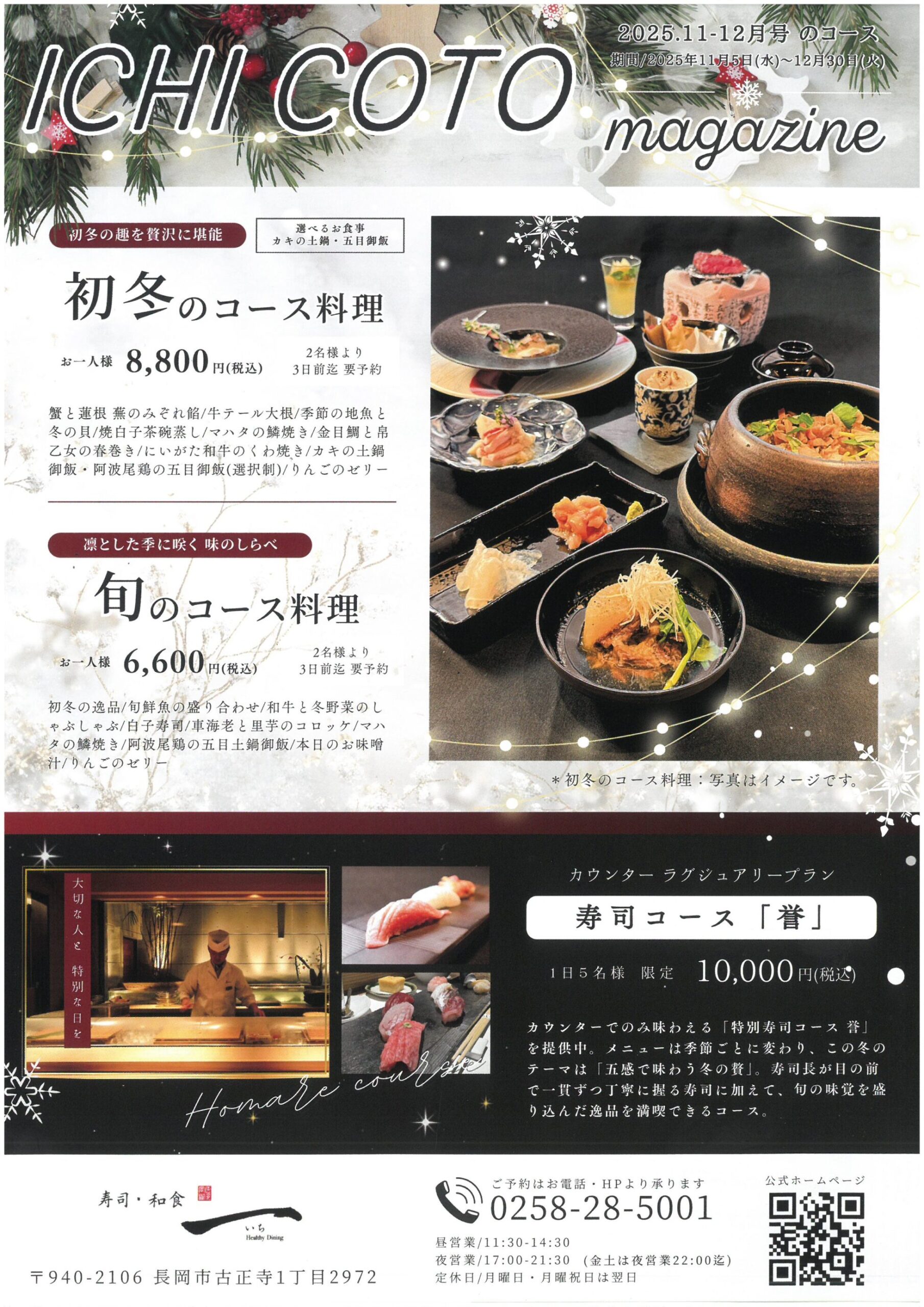 寿司・和食一 【寿司・和食一チラシ】コース料理・寿司コース 掲載期間:2025年11月19日〜2025年12月30日 中越 グルメ 画像をクリックして拡大 prev next セール・新店情報を見逃さない! ガタチラをホーム画面に追加して、 最新情報をすぐチェック▶追加方法はかんたん♪ 関連 どれもおいしそうだな~♪
