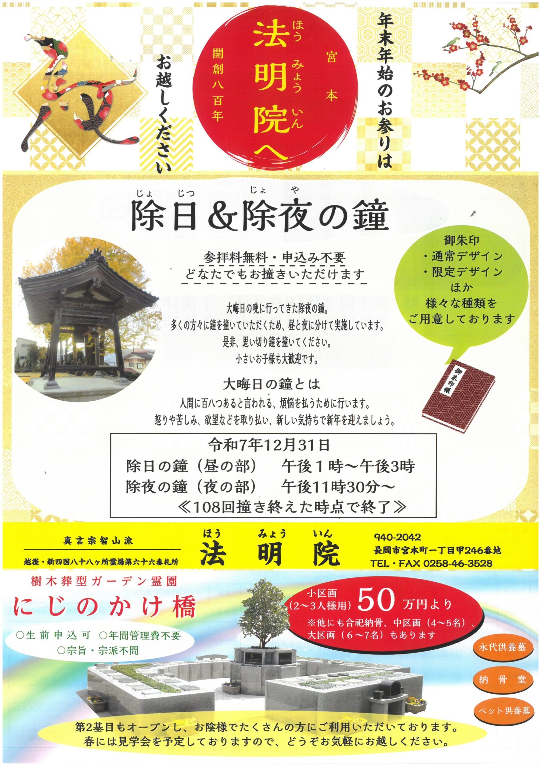 法明院 【法明院チラシ】除日&除夜の鐘 掲載期間:2025年12月27日〜2025年12月31日 中越 イベント 画像をクリックして拡大 prev next セール・新店情報を見逃さない! ガタチラをホーム画面に追加して、 最新情報をすぐチェック▶追加方法はかんたん♪ 関連 御朱印の限定デザイン気になるわ~♪
