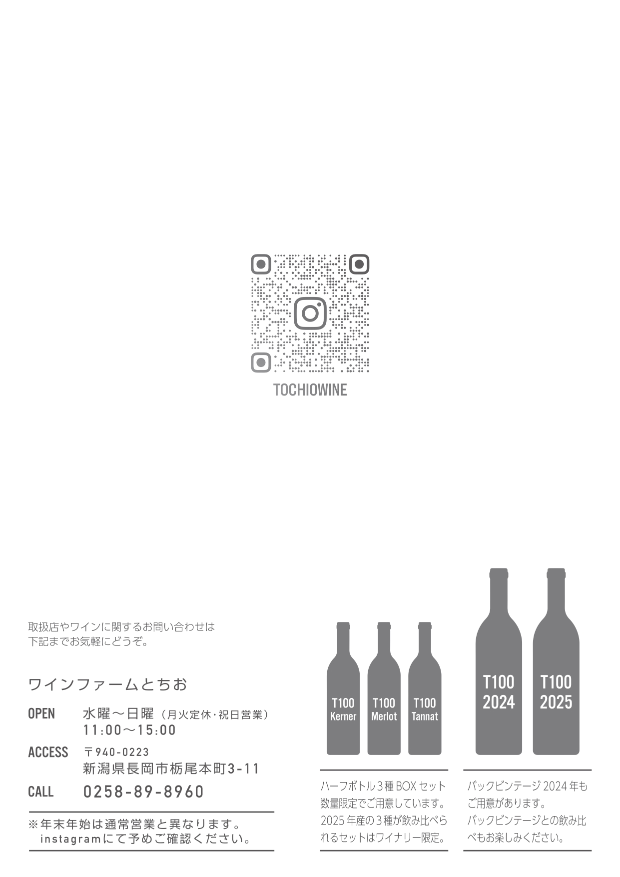 ワインファームとちお 【ワインファームとちおチラシ】2025年産新酒発売 掲載期間:2025年11月26日〜2025年12月31日 中越 グルメ 画像をクリックして拡大 prev next 「ワインファームとちお」のインスタグラムはこちらから セール・新店情報を見逃さない! ガタチラをホーム画面に追加して、 最新情報をすぐチェック▶追加方法はかんたん♪ 関連 どんなお酒なのか気になるわ♪