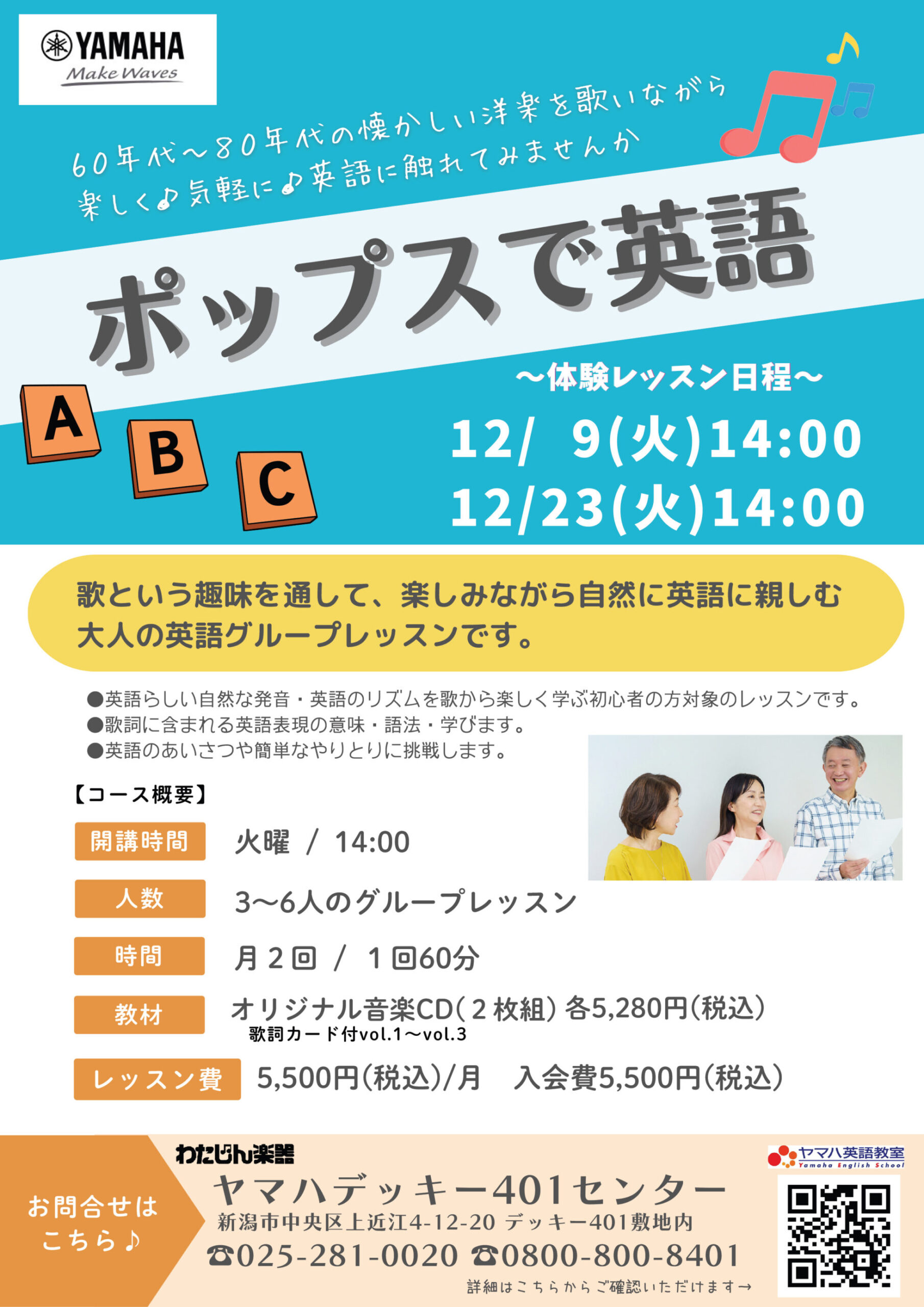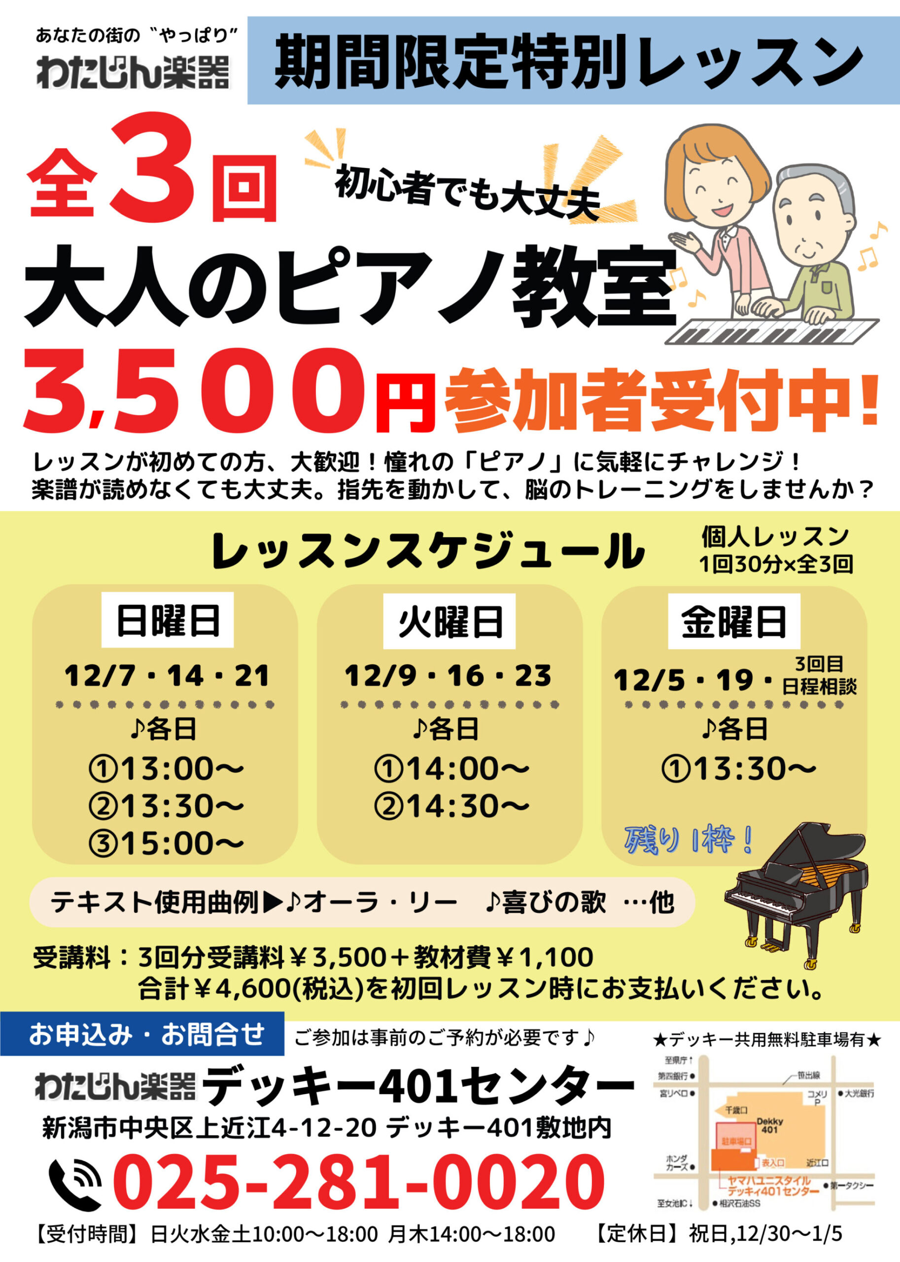 わたじん楽器 ヤマハ デッキー401 【わたじん楽器 ヤマハ デッキー401チラシ】ポップスで英語レッスン/大人ピアノチャレンジレッスン 掲載期間:2025年11月29日〜2025年12月23日 新潟市 生活サービス 画像をクリックして拡大 prev next セール・新店情報を見逃さない! ガタチラをホーム画面に追加して、 最新情報をすぐチェック▶追加方法はかんたん♪ 関連 今聞いてもかっこいい曲がたくさんあるわよね! 私も始めたいわ!