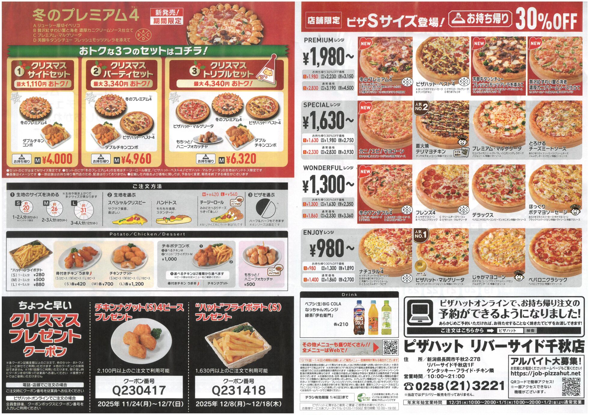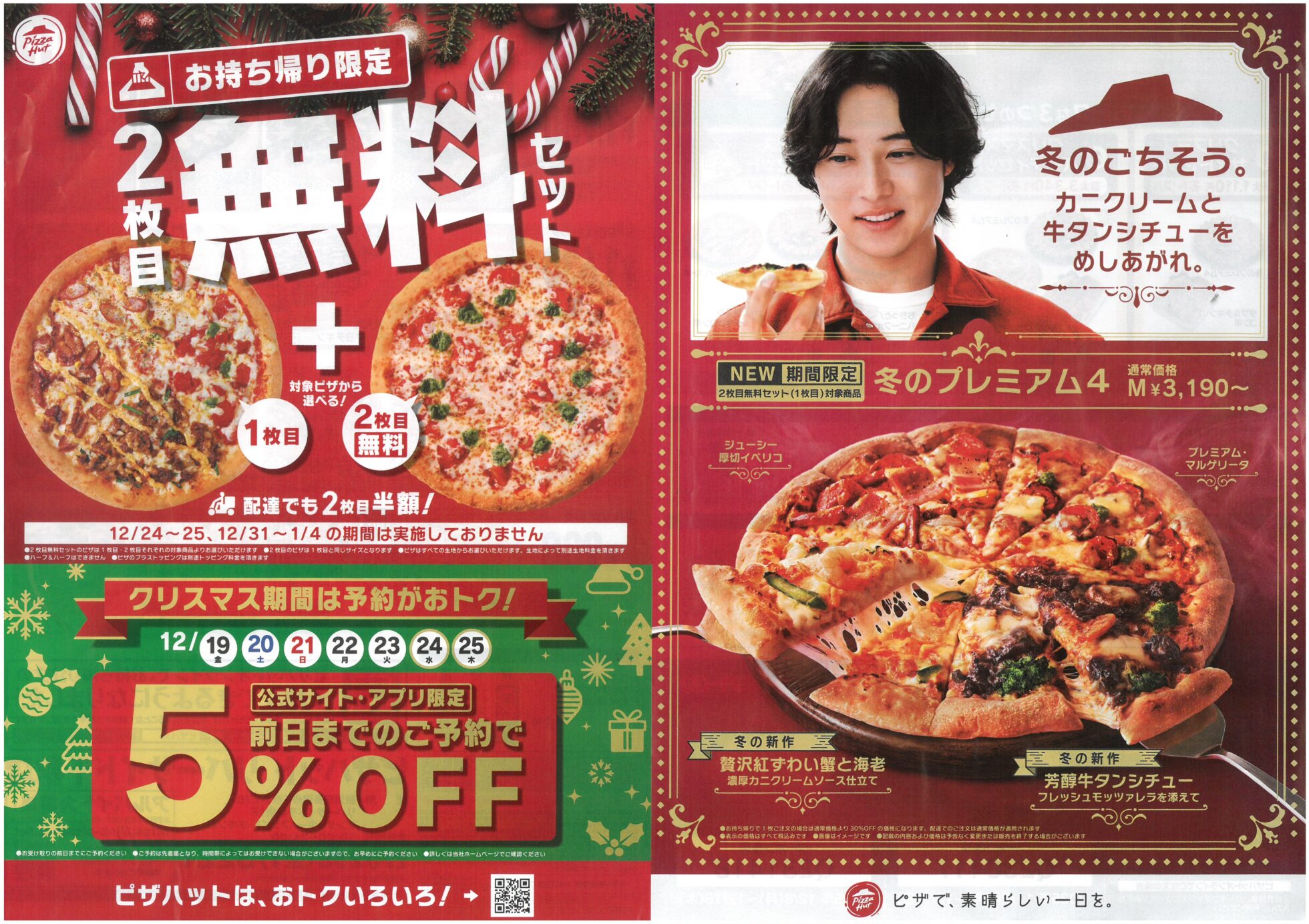 ピザハットリバーサイド千秋店 【ピザハットリバーサイド千秋店チラシ】2枚目無料セット 掲載期間:2025年11月28日〜2026年1月4日 中越 グルメ 画像をクリックして拡大 prev next セール・新店情報を見逃さない! ガタチラをホーム画面に追加して、 最新情報をすぐチェック▶追加方法はかんたん♪ 関連 持ち帰りは2枚目が無料ですって!お得ね!!