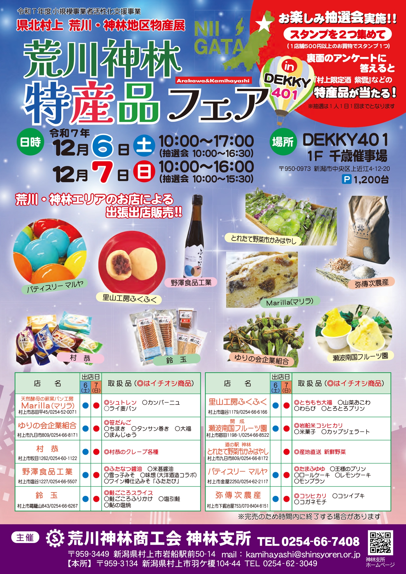 荒川神林商工会 【荒川神林商工会チラシ】荒川神林特産品フェア 掲載期間:2025年11月29日〜2025年12月7日 新潟市 イベント 画像をクリックして拡大 prev next セール・新店情報を見逃さない! ガタチラをホーム画面に追加して、 最新情報をすぐチェック▶追加方法はかんたん♪ 関連 アンケートに答えると、特産品が当たるかも!