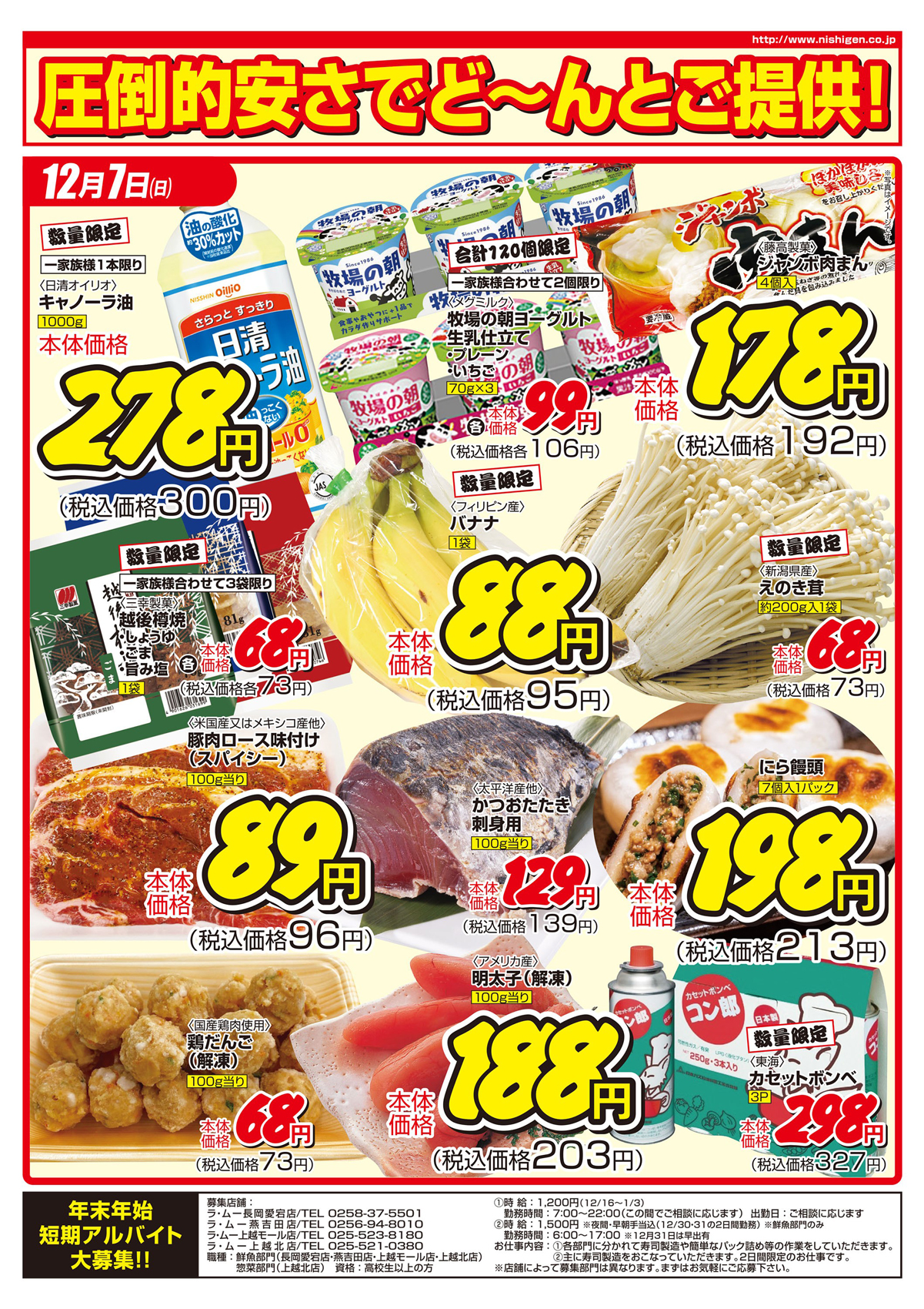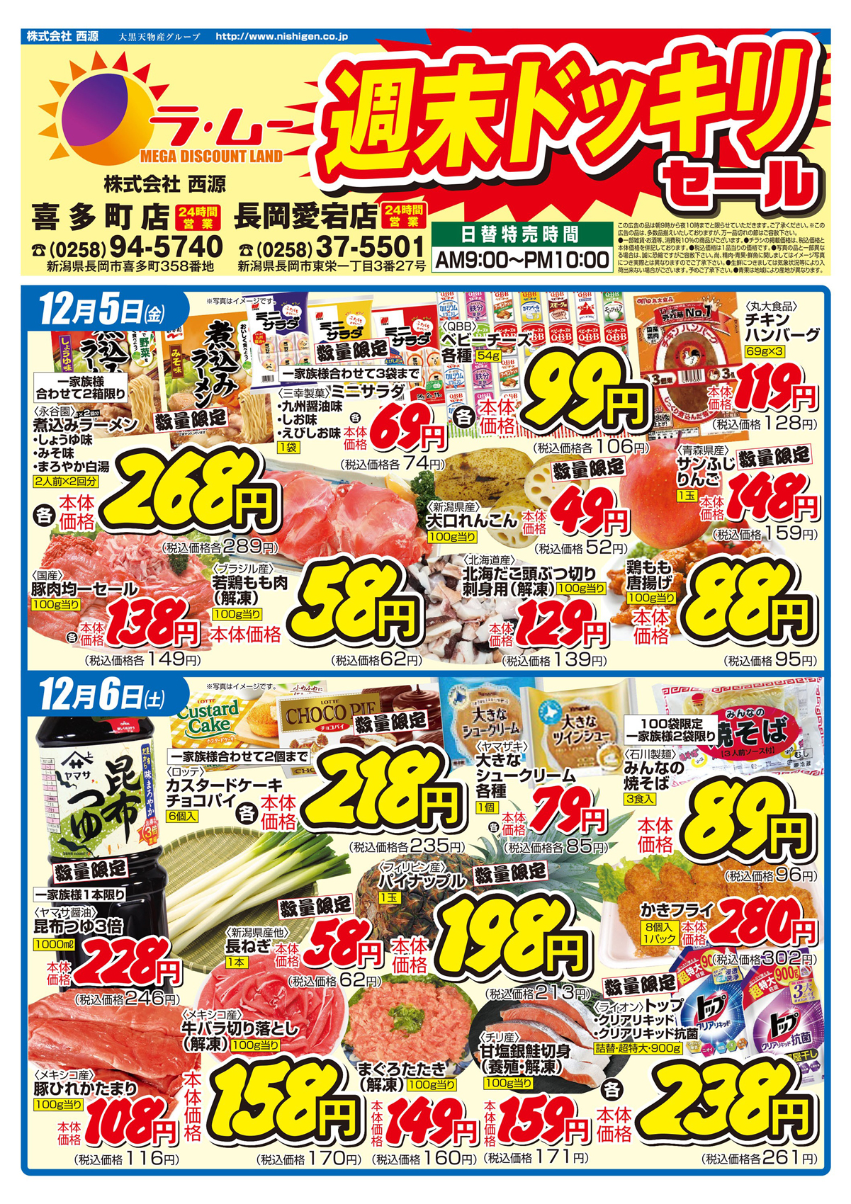 西源 【ラ・ムー喜多町店・長岡愛宕店チラシ】週末ドッキリセール 掲載期間:2025年12月5日〜2025年12月7日 中越 スーパーラ・ムー 画像をクリックして拡大 prev next セール・新店情報を見逃さない! ガタチラをホーム画面に追加して、 最新情報をすぐチェック▶追加方法はかんたん♪ 関連 お買い得品がたくさんね! にら饅頭おいしそう!!