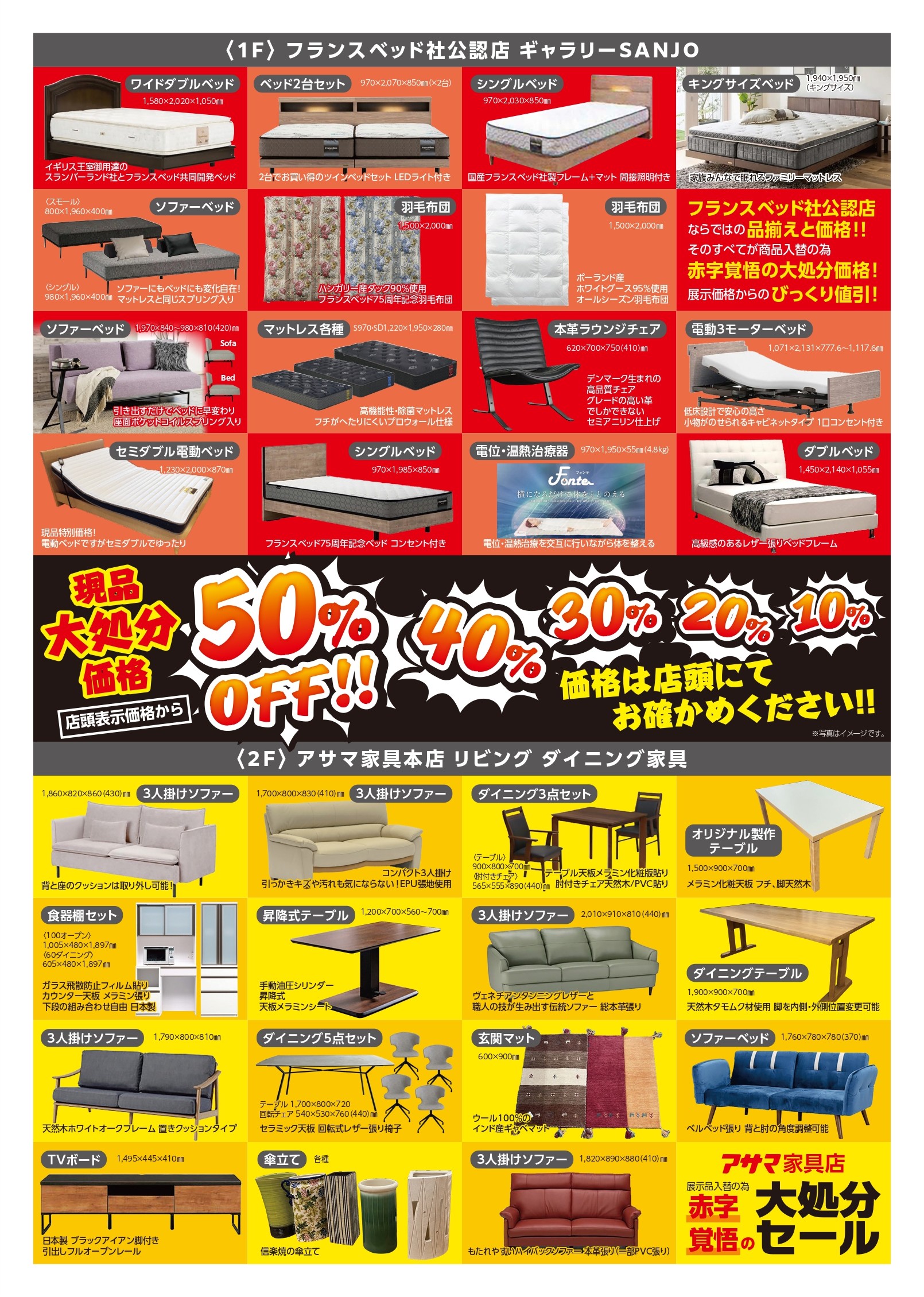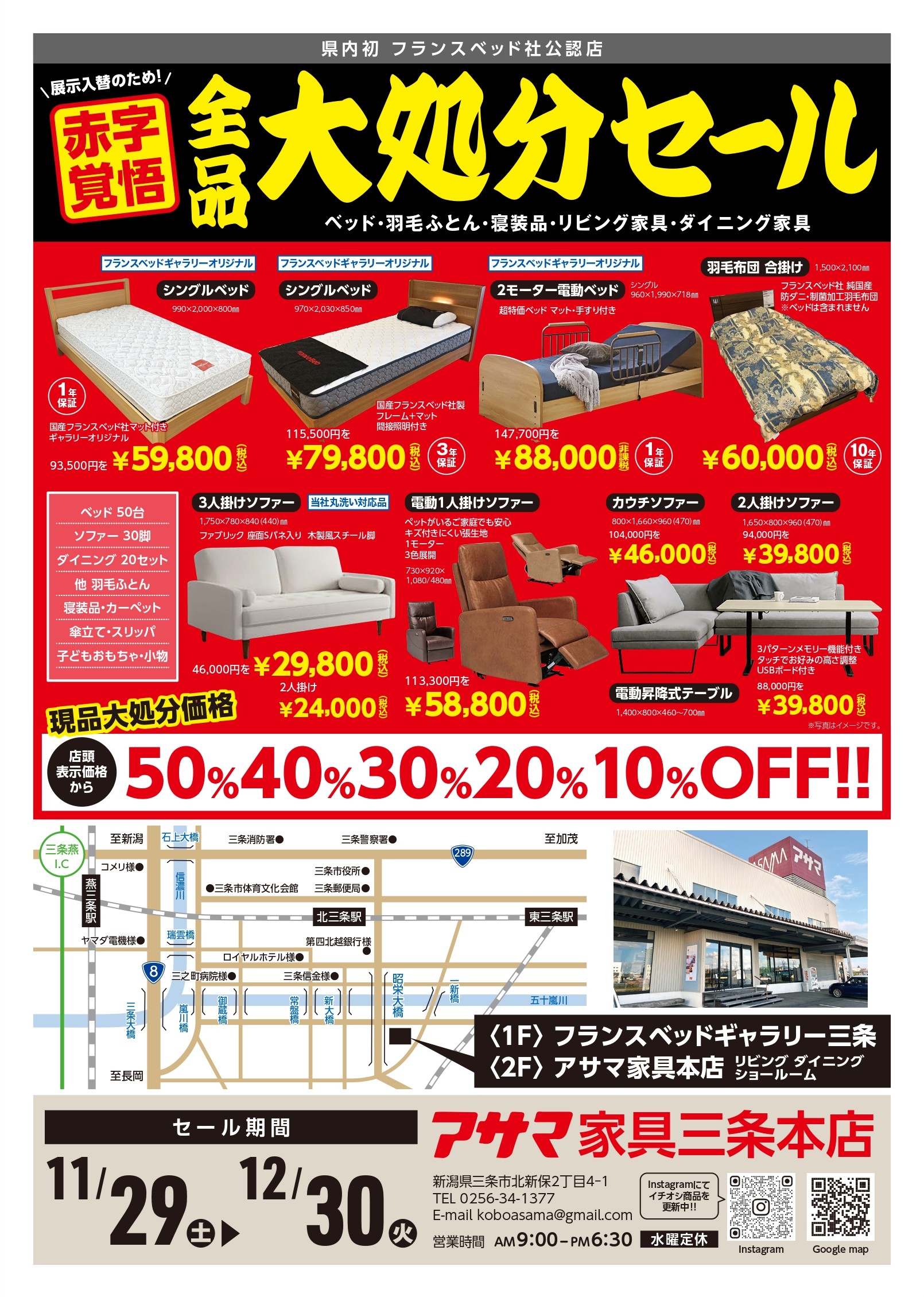 アサマ家具三条本店 【アサマ家具三条本店チラシ】赤字覚悟 全品大処分セール 掲載期間:2025年11月29日〜2025年12月30日 中越下越 インテリア・雑貨 画像をクリックして拡大 prev next 「アウトレット家具アサマBステージ三条店」のInstagramはこちらから セール・新店情報を見逃さない! ガタチラをホーム画面に追加して、 最新情報をすぐチェック▶追加方法はかんたん♪ 関連 この機会に電動ベットに帰替えたいわ!