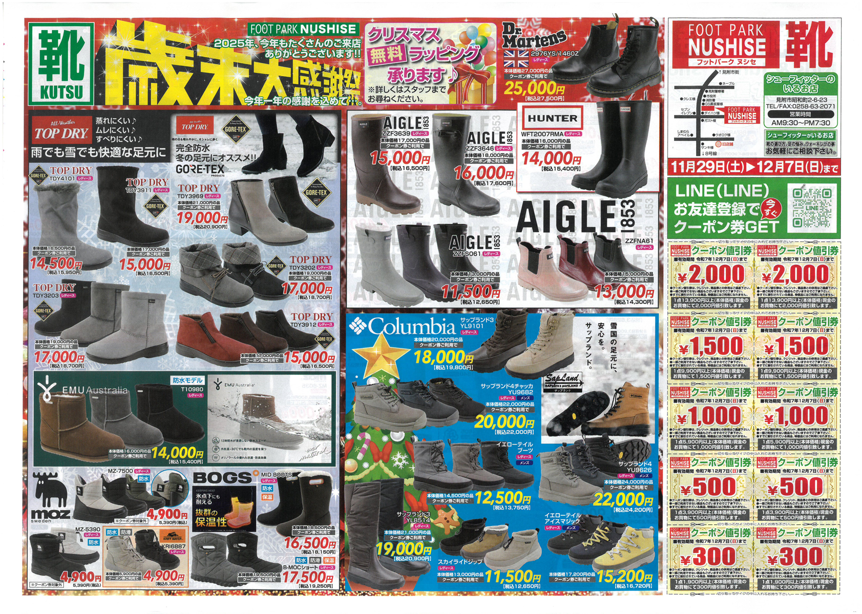 フットパークヌシセ 【フットパークヌシセチラシ】歳末大感謝祭 掲載期間:2025年11月29日〜2025年12月7日 中越 ファッション 画像をクリックして拡大 prev next セール・新店情報を見逃さない! ガタチラをホーム画面に追加して、 最新情報をすぐチェック▶追加方法はかんたん♪ 関連 お洒落な防寒靴で冬も楽しく過ごしたいわ!