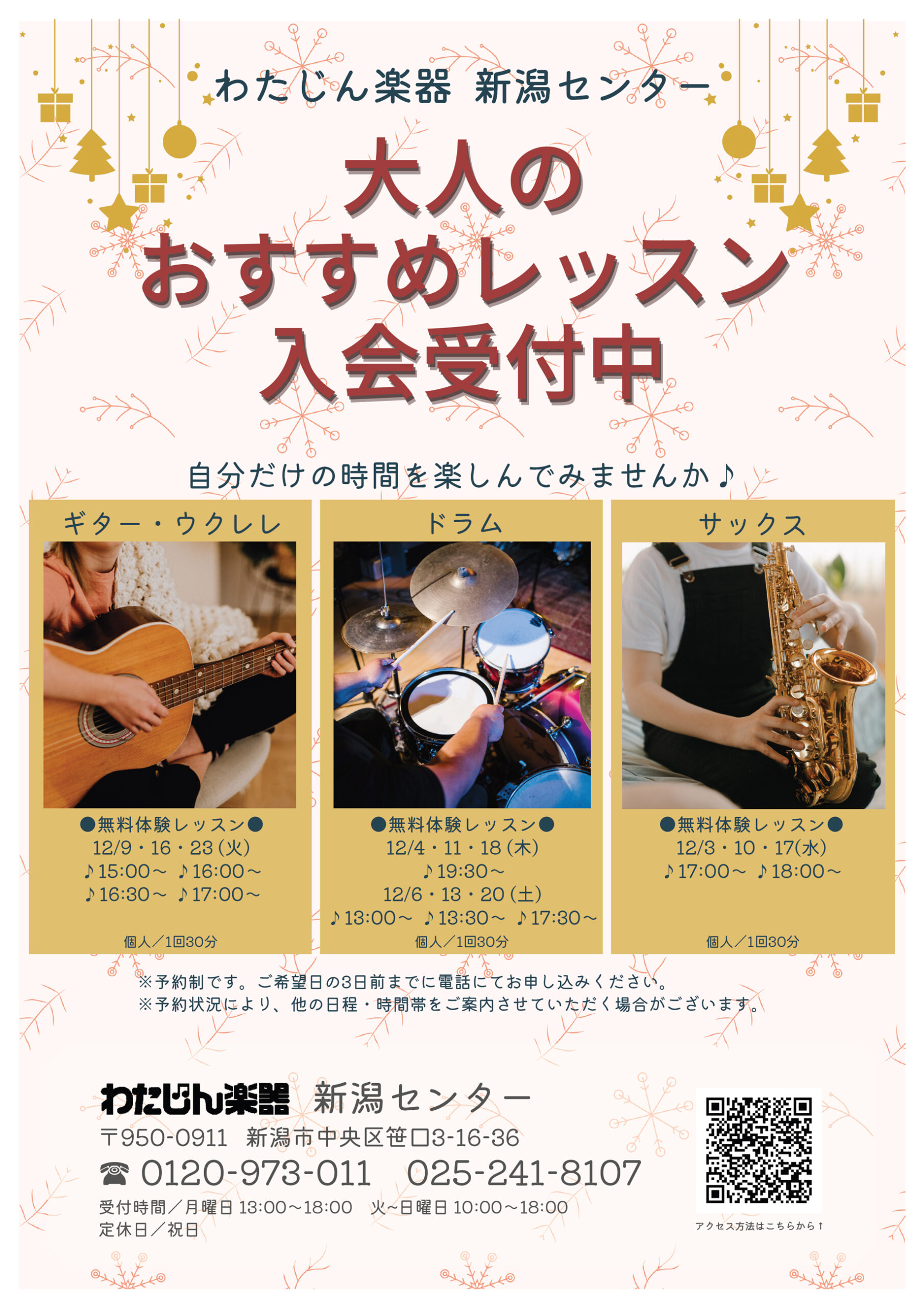 TOP > チラシ情報 > 生活サービス > 【わたじん楽器 新潟センターチラシ】大人のおすすめレッスン/大人のピアノ教室