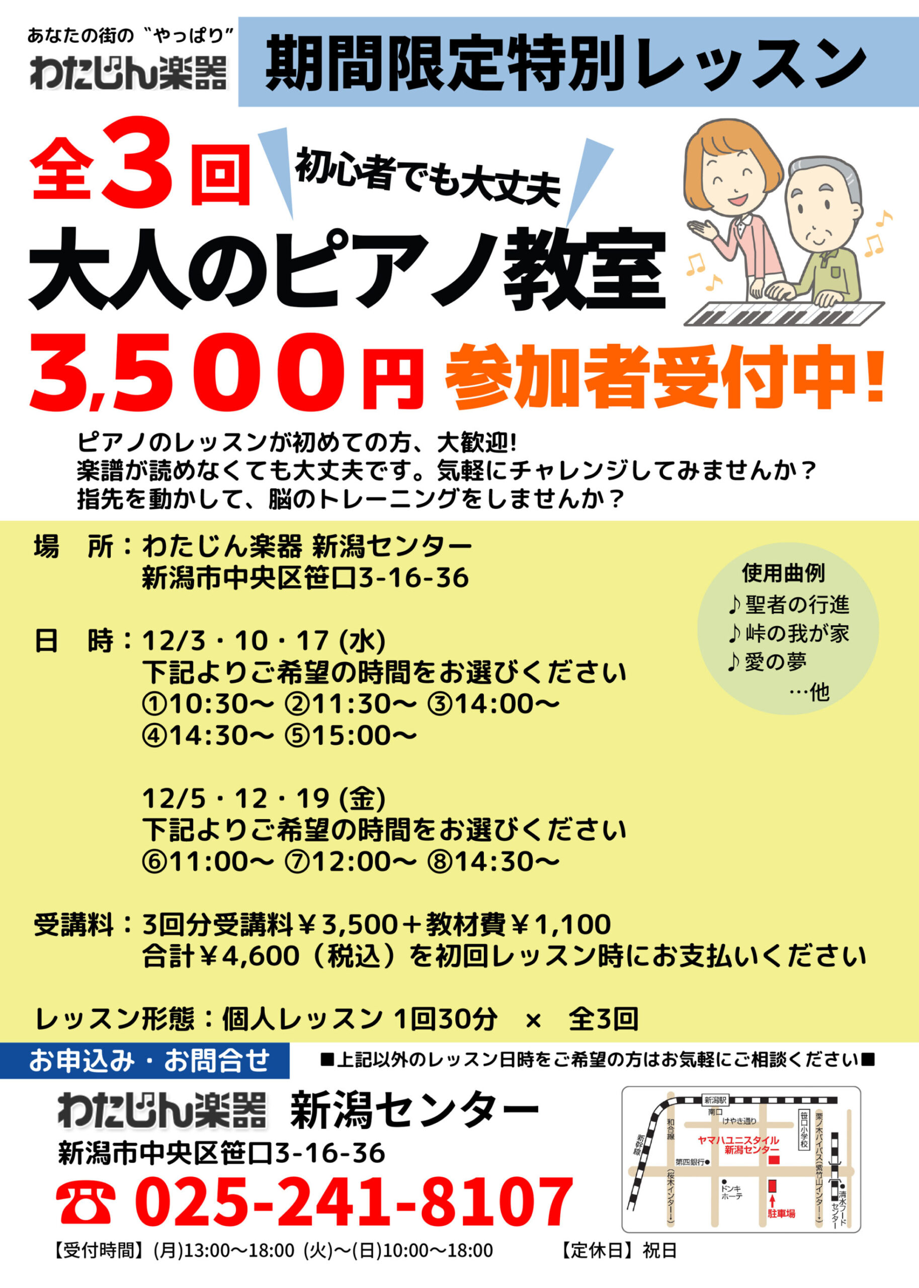 【わたじん楽器 新潟センターチラシ】大人のおすすめレッスン/大人のピアノ教室