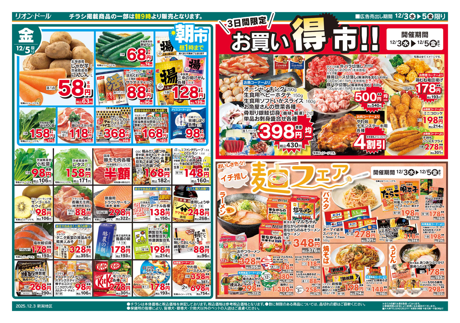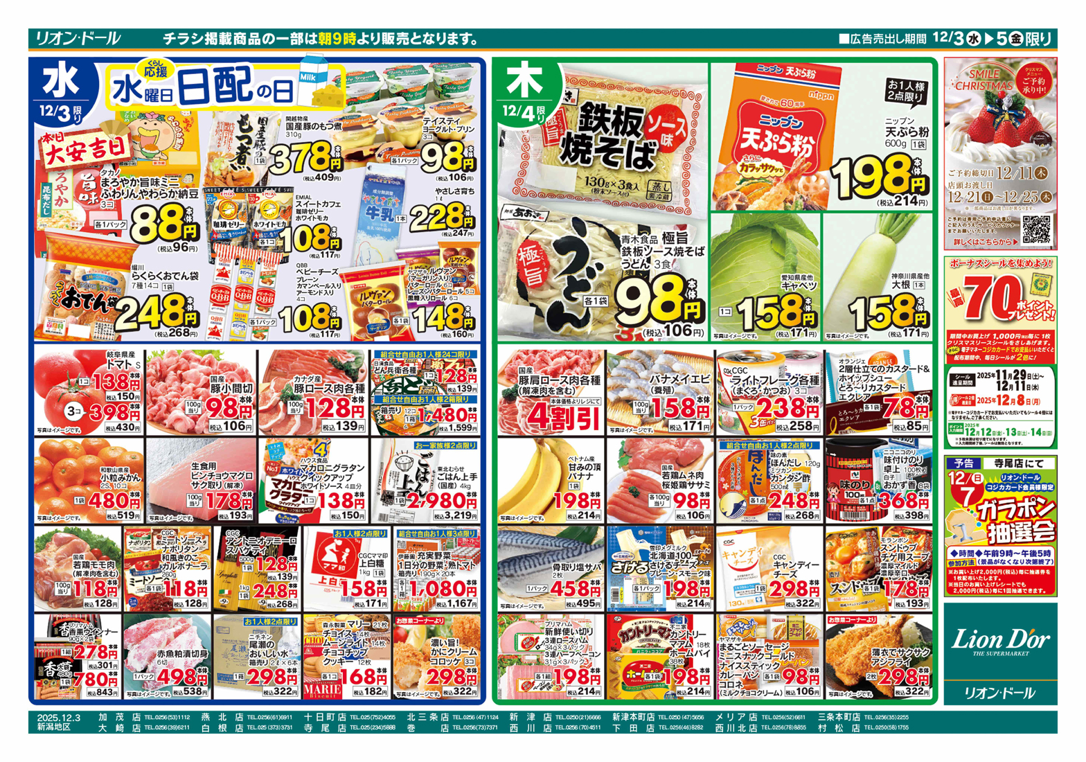 (株)リオン・ドールコーポレーション 【リオン・ドールチラシ】お買い得市!! 掲載期間:2025年12月3日〜2025年12月5日 中越新潟市下越 スーパーリオン・ドール 画像をクリックして拡大 prev next 「リオン・ドール」のホームページはこちらから セール・新店情報を見逃さない! ガタチラをホーム画面に追加して、 最新情報をすぐチェック▶追加方法はかんたん♪ 関連 やわ旨チキンステーキ用が4割引ですって!