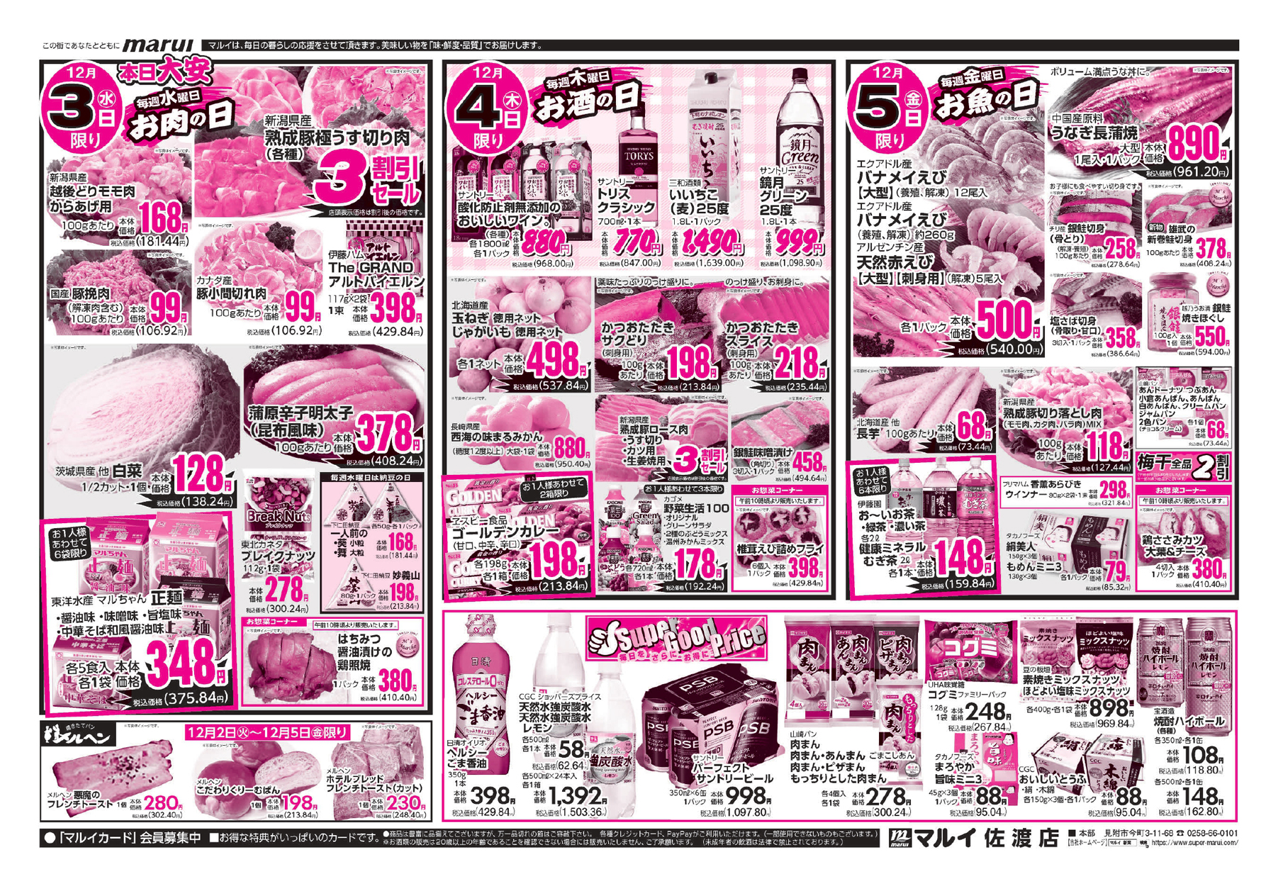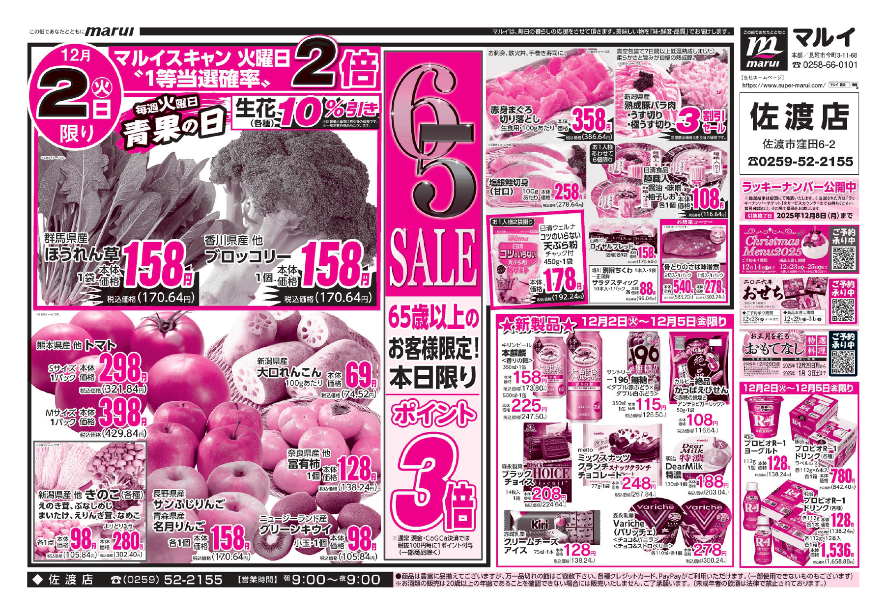 株式会社マルイ 【マルイ佐渡店チラシ】65SALE 掲載期間:2025年12月1日〜2025年12月5日 佐渡 スーパーマルイ 画像をクリックして拡大 prev next セール・新店情報を見逃さない! ガタチラをホーム画面に追加して、 最新情報をすぐチェック▶追加方法はかんたん♪ 関連 私の出番ね! 65歳以上はポイント3倍よ!!