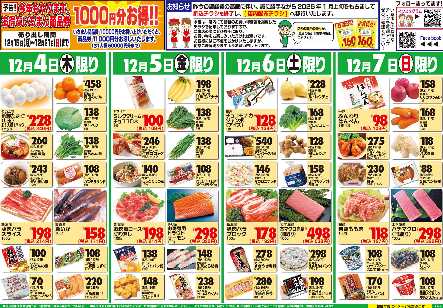 いちまん 【いちまんチラシ】いちまんの歳末・迎春商品のご案内 掲載期間:2025年12月4日〜2025年12月7日 新潟市 スーパー 画像をクリックして拡大 prev next セール・新店情報を見逃さない! ガタチラをホーム画面に追加して、 最新情報をすぐチェック▶追加方法はかんたん♪ 関連 「お刺身盛り合わせ」良いわね~♪