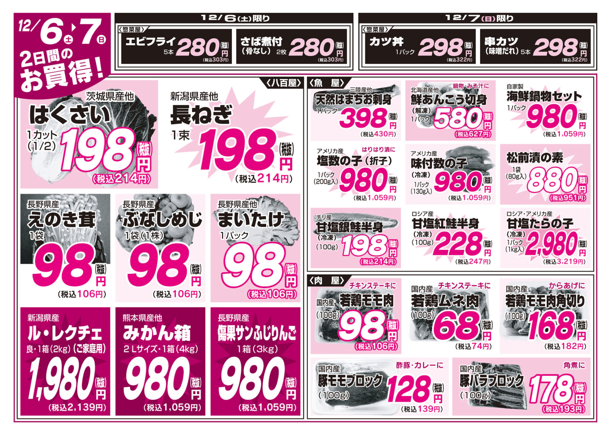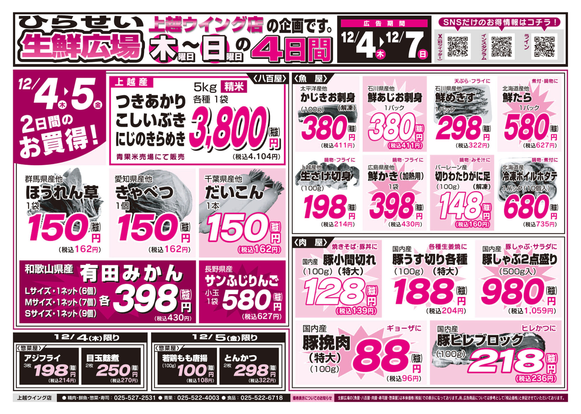 上越フルーツ 【ひらせい生鮮広場 上越ウイング店チラシ】木曜日~日曜日の4日間 掲載期間:2025年12月4日〜2025年12月7日 上越 スーパーひらせい生鮮広場 画像をクリックして拡大 prev next セール・新店情報を見逃さない! ガタチラをホーム画面に追加して、 最新情報をすぐチェック▶追加方法はかんたん♪ 関連 りんごがお買得だわ♪