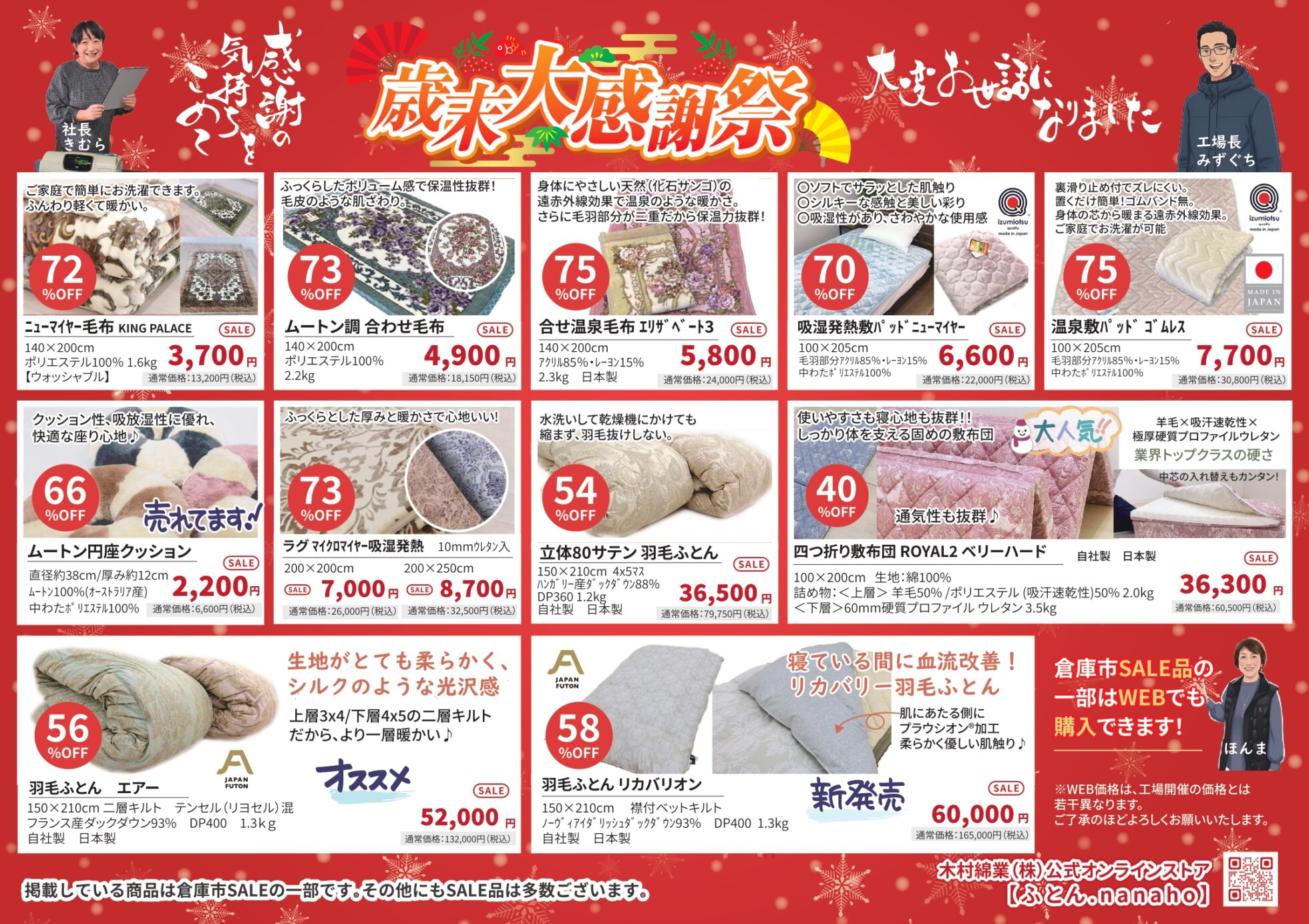木村綿業 【木村綿業チラシ】歳末BIGバーゲン 掲載期間:2025年12月8日〜2025年12月14日 新潟市 インテリア・雑貨 画像をクリックして拡大 prev next セール・新店情報を見逃さない! ガタチラをホーム画面に追加して、 最新情報をすぐチェック▶追加方法はかんたん♪ 関連 羽毛布団がお買得だわ~♪