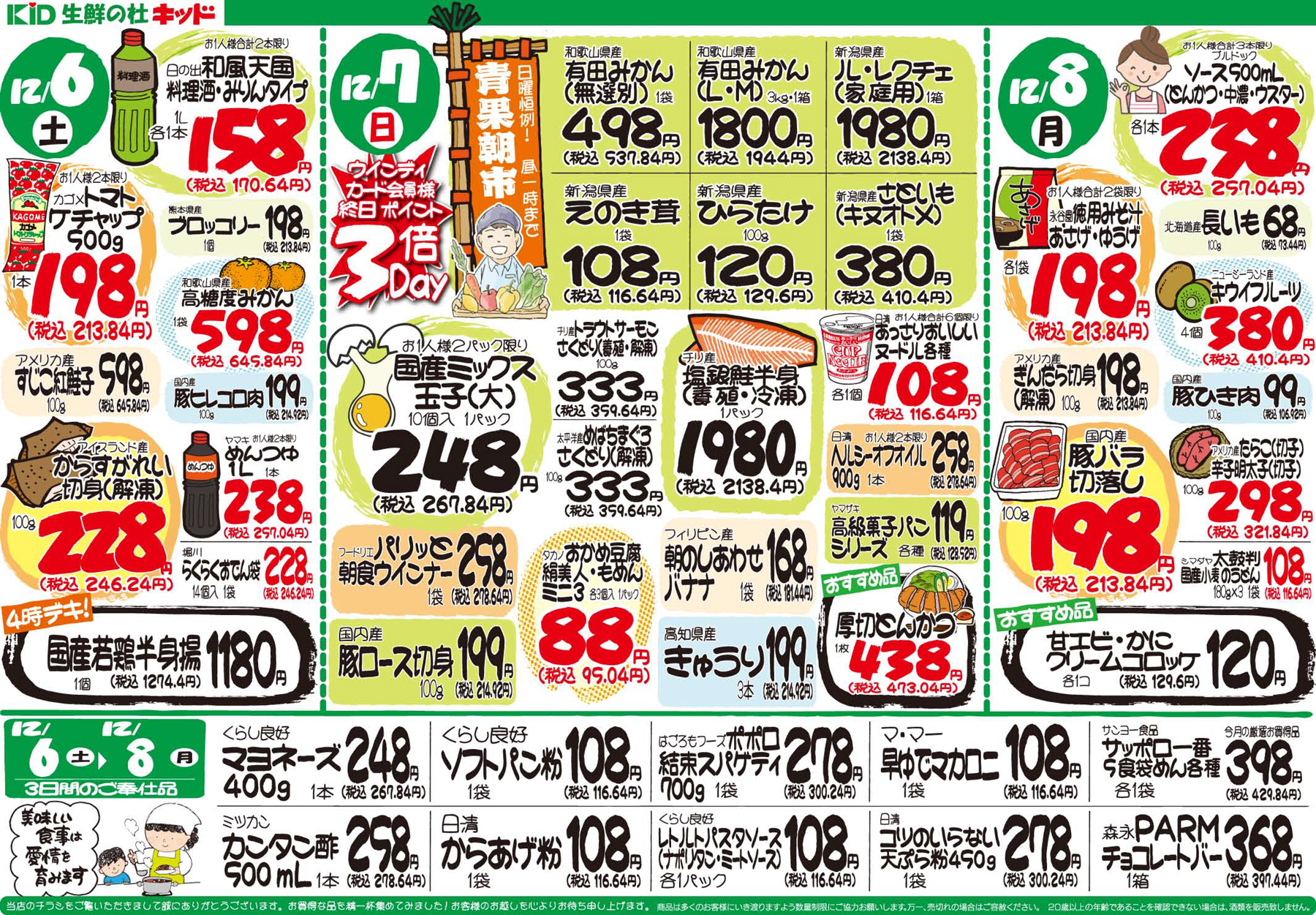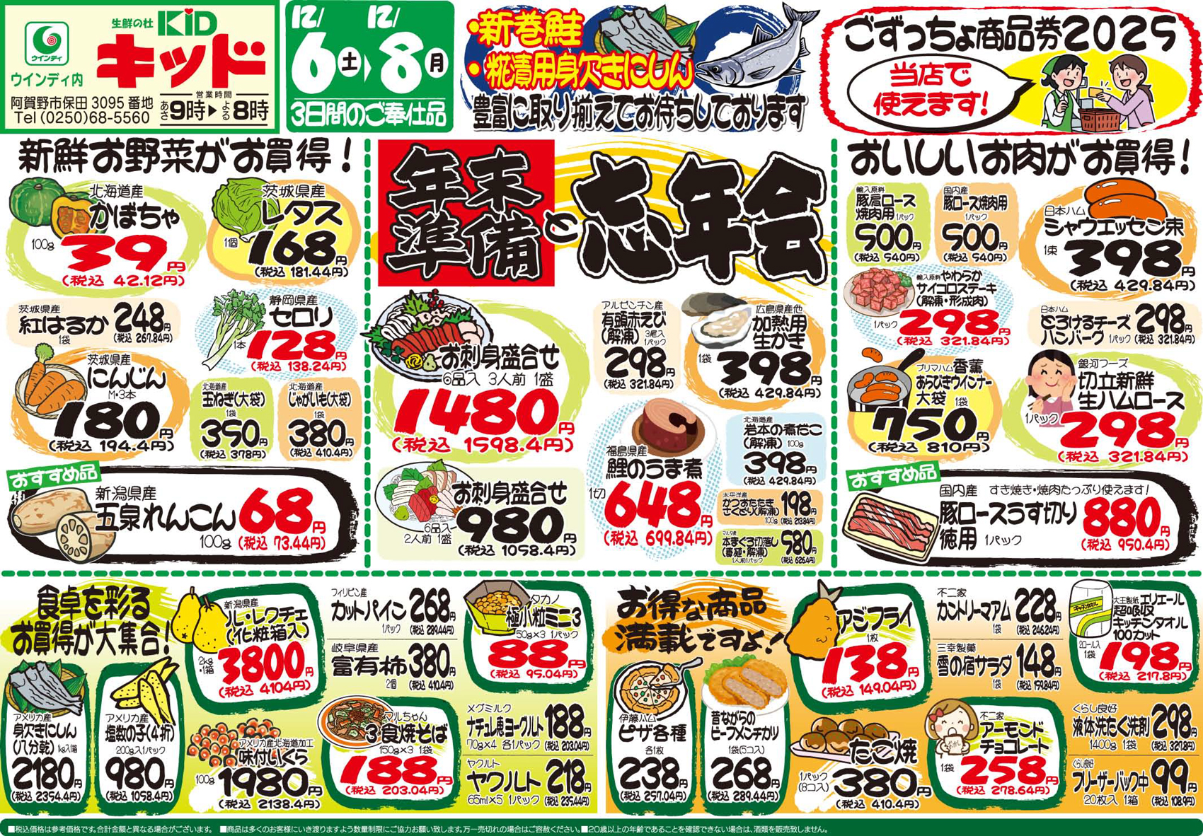 キッド 【生鮮の杜キッドチラシ】年末準備と忘年会 掲載期間:2025年12月6日〜2025年12月8日 下越 スーパー 画像をクリックして拡大 prev next セール・新店情報を見逃さない! ガタチラをホーム画面に追加して、 最新情報をすぐチェック▶追加方法はかんたん♪ 関連 かきを買って牡蠣鍋も良いわね~♪