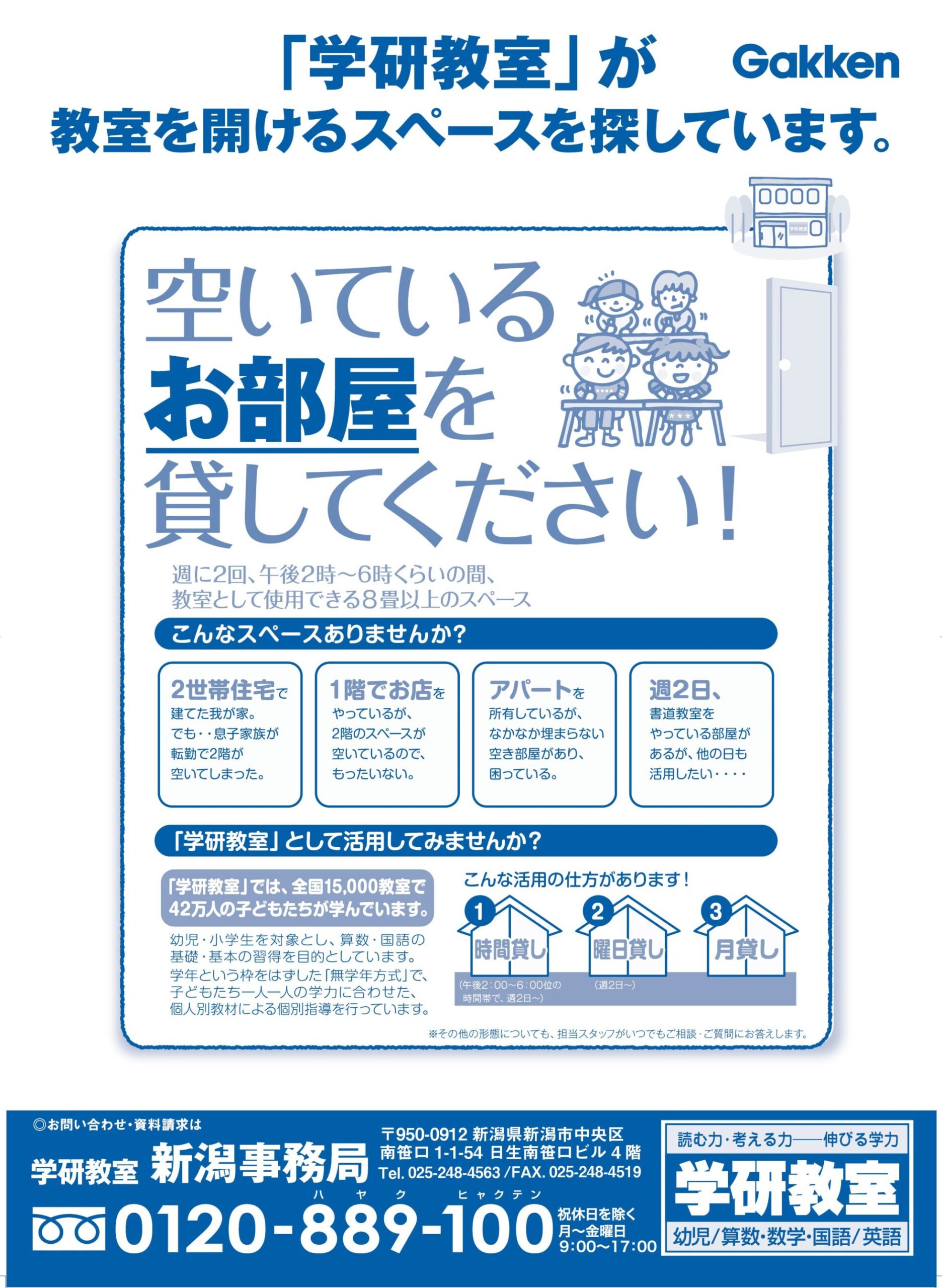 学研 新潟事務局 【学研 新潟事務局チラシ】空いてるお部屋お貸しください 掲載期間:2025年12月7日〜2025年12月31日 新潟市 塾・スイミング 画像をクリックして拡大 prev next セール・新店情報を見逃さない! ガタチラをホーム画面に追加して、 最新情報をすぐチェック▶追加方法はかんたん♪ 関連 空き部屋の活用ができて良いわね♪