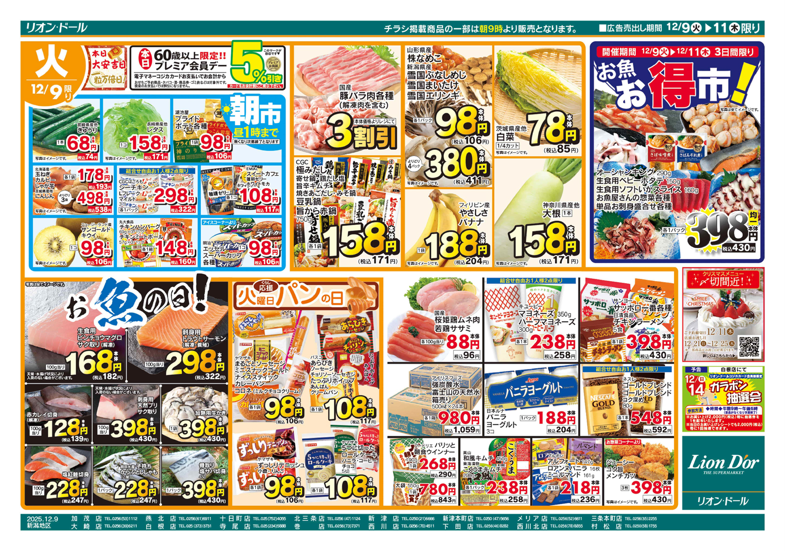株式会社リオン・ドールコーポレーション 【リオン・ドールチラシ】お魚お得市! 掲載期間:2025年12月9日〜2025年12月11日 中越新潟市下越 スーパーリオン・ドール 画像をクリックして拡大 prev next 「リオン・ドール」のホームページはこちらから セール・新店情報を見逃さない! ガタチラをホーム画面に追加して、 最新情報をすぐチェック▶追加方法はかんたん♪ 関連 豚バラもお買得だわ♪