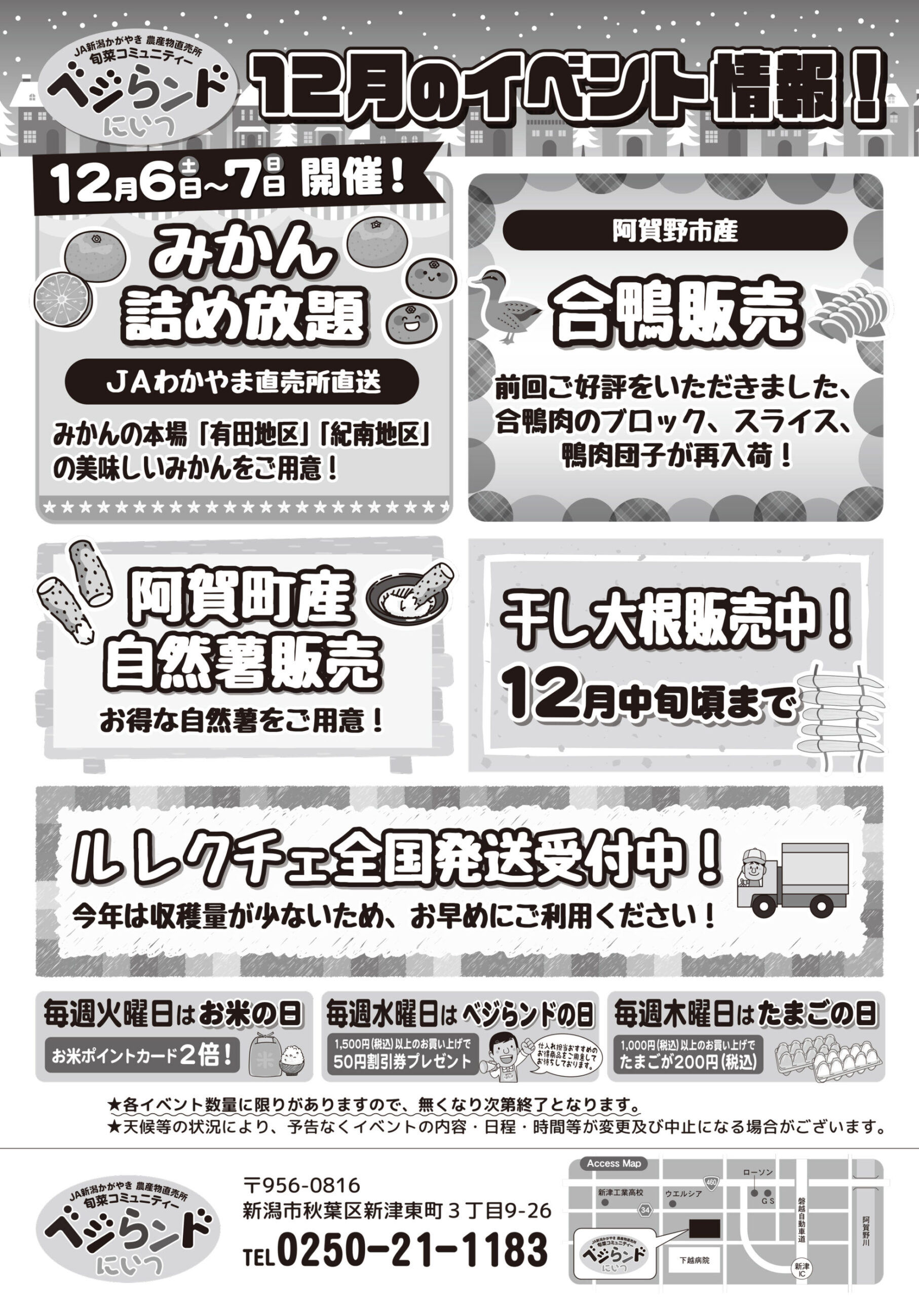 JA新潟かがやき 【ベジらンドにいつチラシ】12月のイベント情報! 掲載期間:2025年12月6日〜2025年12月31日 新潟市 生活サービス 画像をクリックして拡大 prev next セール・新店情報を見逃さない! ガタチラをホーム画面に追加して、 最新情報をすぐチェック▶追加方法はかんたん♪ 関連 みかんの詰め放題やりたいわ~♪