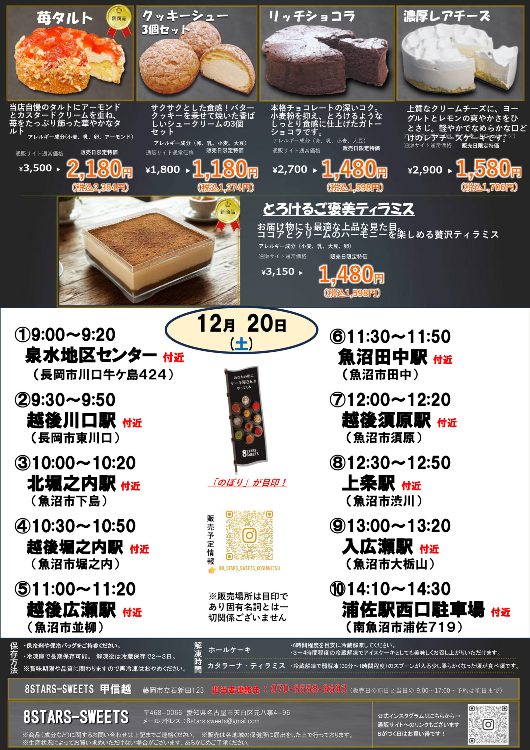 8STARS-SWEETS 【8STARS-SWEETSチラシ】あなたの街にケーキ屋さんがやってくる12月20日限定移動販売 掲載期間:2025年12月18日〜2025年12月20日 中越 グルメ 画像をクリックして拡大 prev next セール・新店情報を見逃さない! ガタチラをホーム画面に追加して、 最新情報をすぐチェック▶追加方法はかんたん♪ 関連 カマンベールスフレ ふわふわそうね~♪