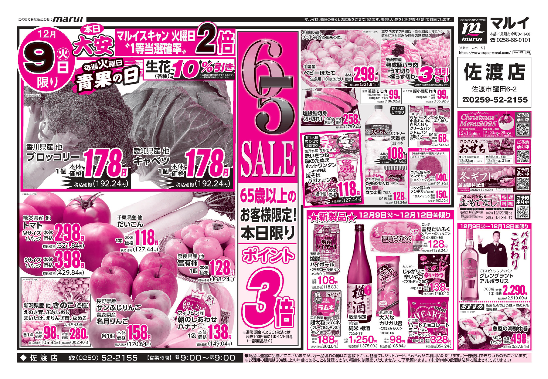 株式会社マルイ 【マルイ佐渡店チラシ】65SALE 掲載期間:2025年12月8日〜2025年12月12日 佐渡 スーパーマルイ 画像をクリックして拡大 prev next セール・新店情報を見逃さない! ガタチラをホーム画面に追加して、 最新情報をすぐチェック▶追加方法はかんたん♪ 関連 大根がお買得だわ♪