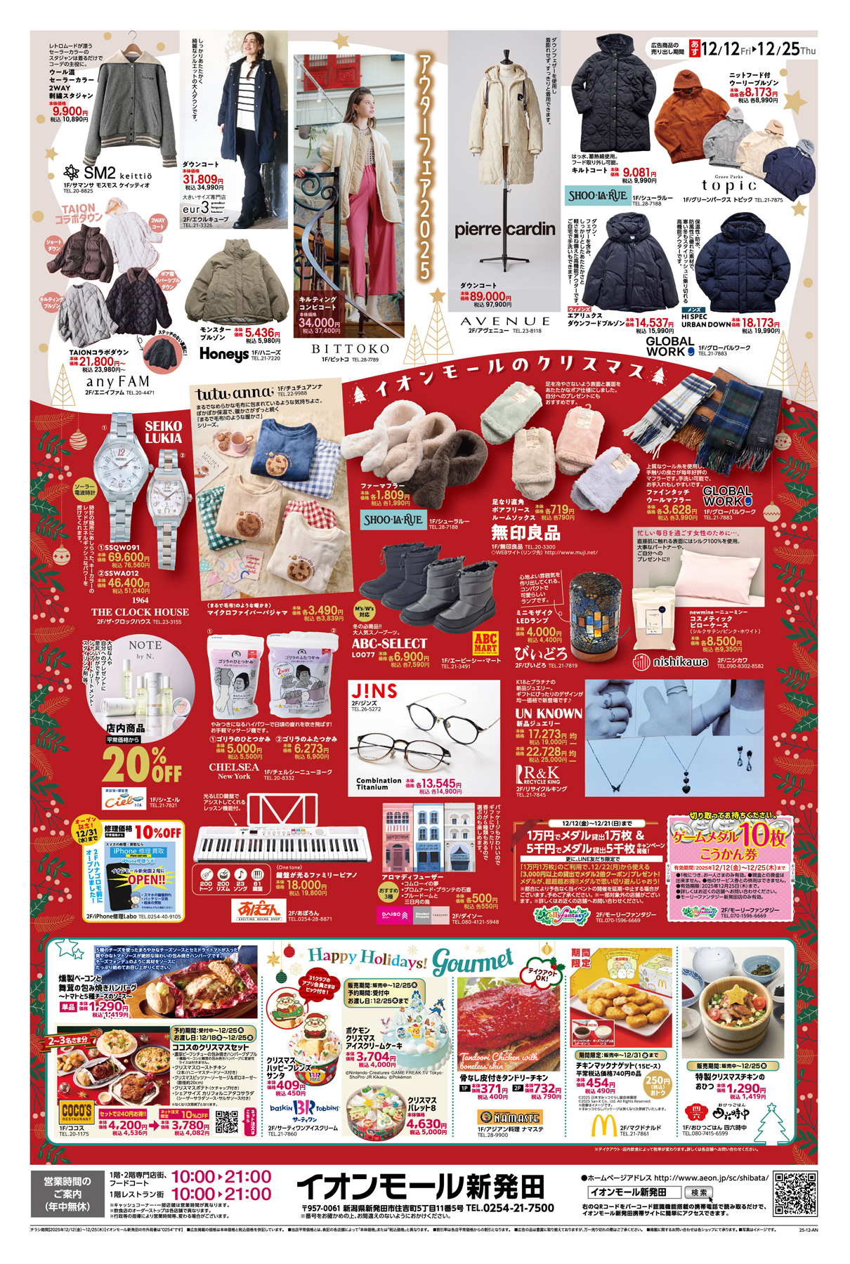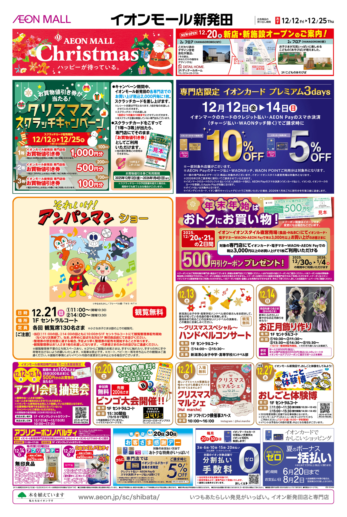イオンモール新発田 【イオンモール新発田チラシ】クリスマス 掲載期間:2025年12月11日〜2025年12月25日 下越 百貨店・ショッピングセンター 画像をクリックして拡大 prev next セール・新店情報を見逃さない! ガタチラをホーム画面に追加して、 最新情報をすぐチェック▶追加方法はかんたん♪ 関連 21日は「それいけ!アンパンマンショー」があるわよ! 楽しそう!!