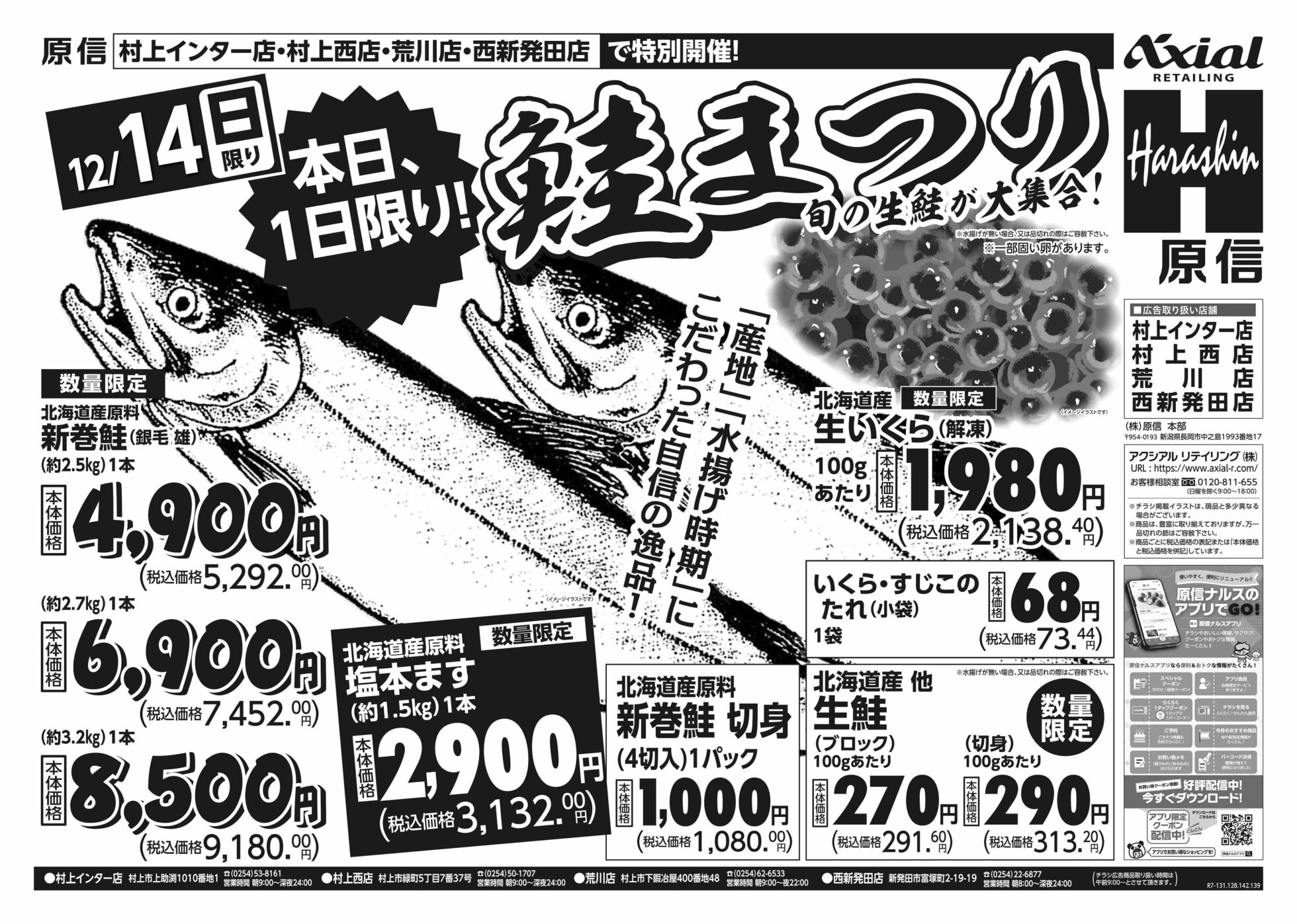 原信ナルス 【原信ナルス 村上インター店・村上西店・荒川店・西新発田店チラシ】本日、1日限り!鮭まつり 掲載期間:2025年12月14日〜2025年12月14日 下越 スーパー原信ナルス 画像をクリックして拡大 prev next 対象:村上インター店、村上西店、荒川店、西新発田店 セール・新店情報を見逃さない! ガタチラをホーム画面に追加して、 最新情報をすぐチェック▶追加方法はかんたん♪ 関連 「いくら」は数量限定ですって! 無くなる前に買いに行かなきゃ!!
