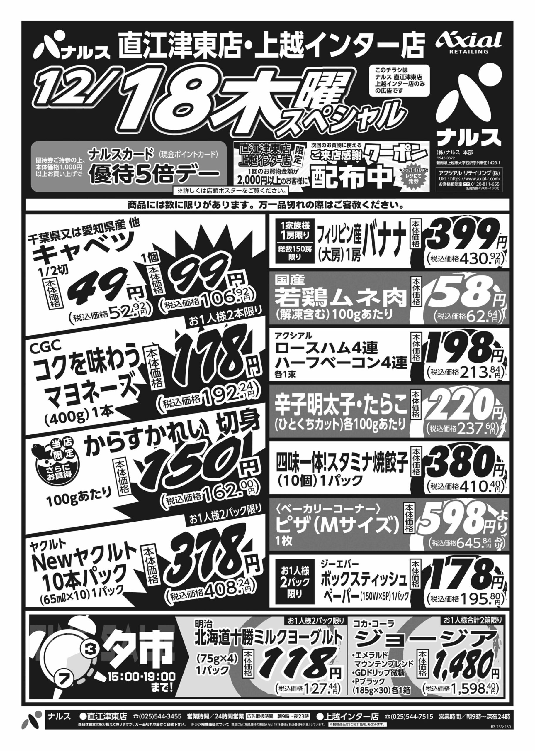 原信ナルス 【原信ナルス直江津東店・上越インター店チラシ】木曜スペシャル/金曜スペシャル 掲載期間:2025年12月18日〜2025年12月19日 上越 スーパー原信ナルス 画像をクリックして拡大 prev next 対象:直江津東店・上越インター店 セール・新店情報を見逃さない! ガタチラをホーム画面に追加して、 最新情報をすぐチェック▶追加方法はかんたん♪ 関連 金曜日はキムチがお買い得! キムチ鍋にしようかしら!!