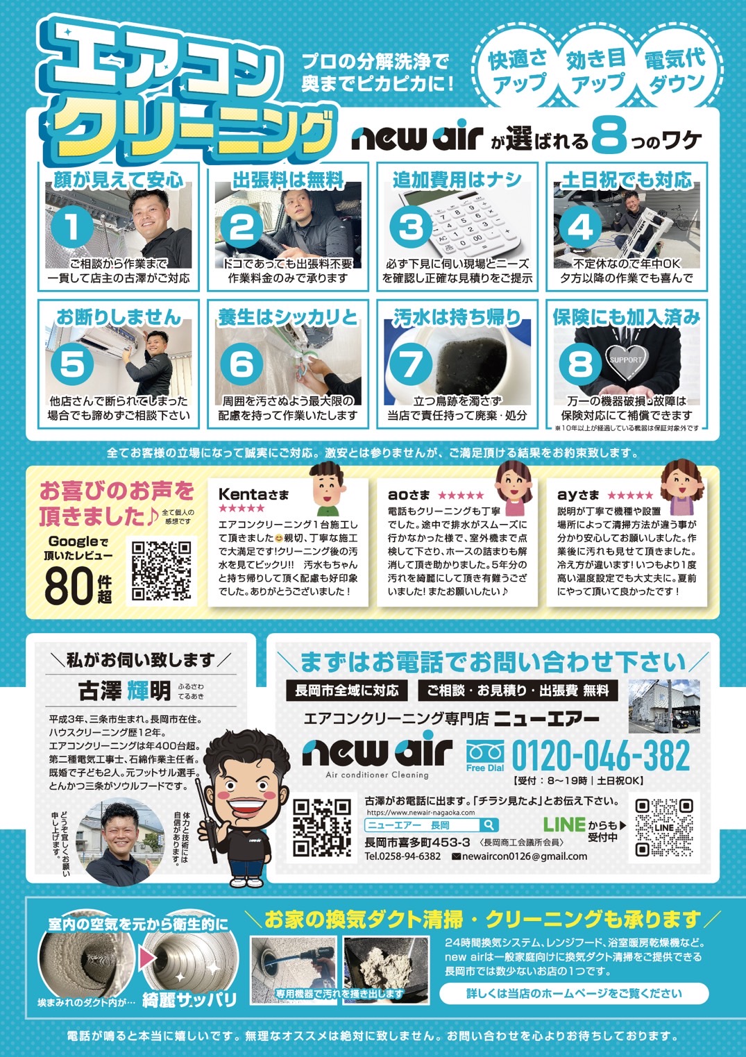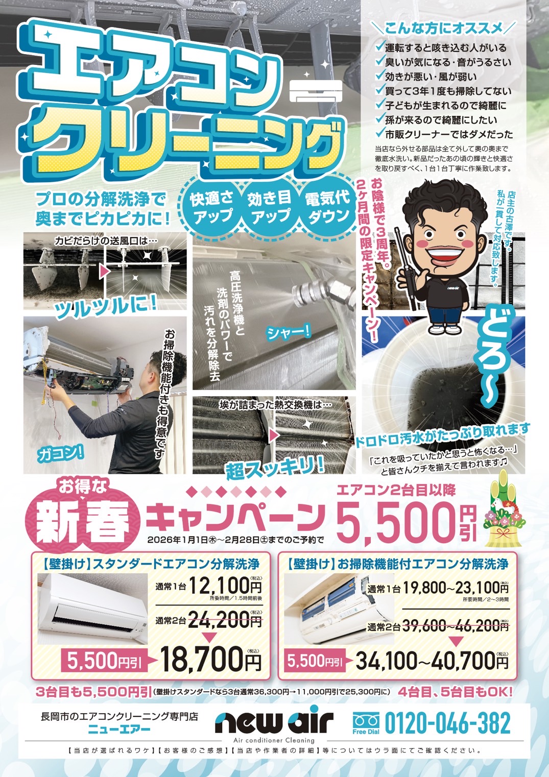 new air 【new airチラシ】エアコンクリーニング 掲載期間:2025年12月26日〜2026年2月28日 中越 生活サービス 画像をクリックして拡大 prev next 「new air」のホームページはこちらから セール・新店情報を見逃さない! ガタチラをホーム画面に追加して、 最新情報をすぐチェック▶追加方法はかんたん♪ 関連 定期的にプロに掃除してもらいたいわね!