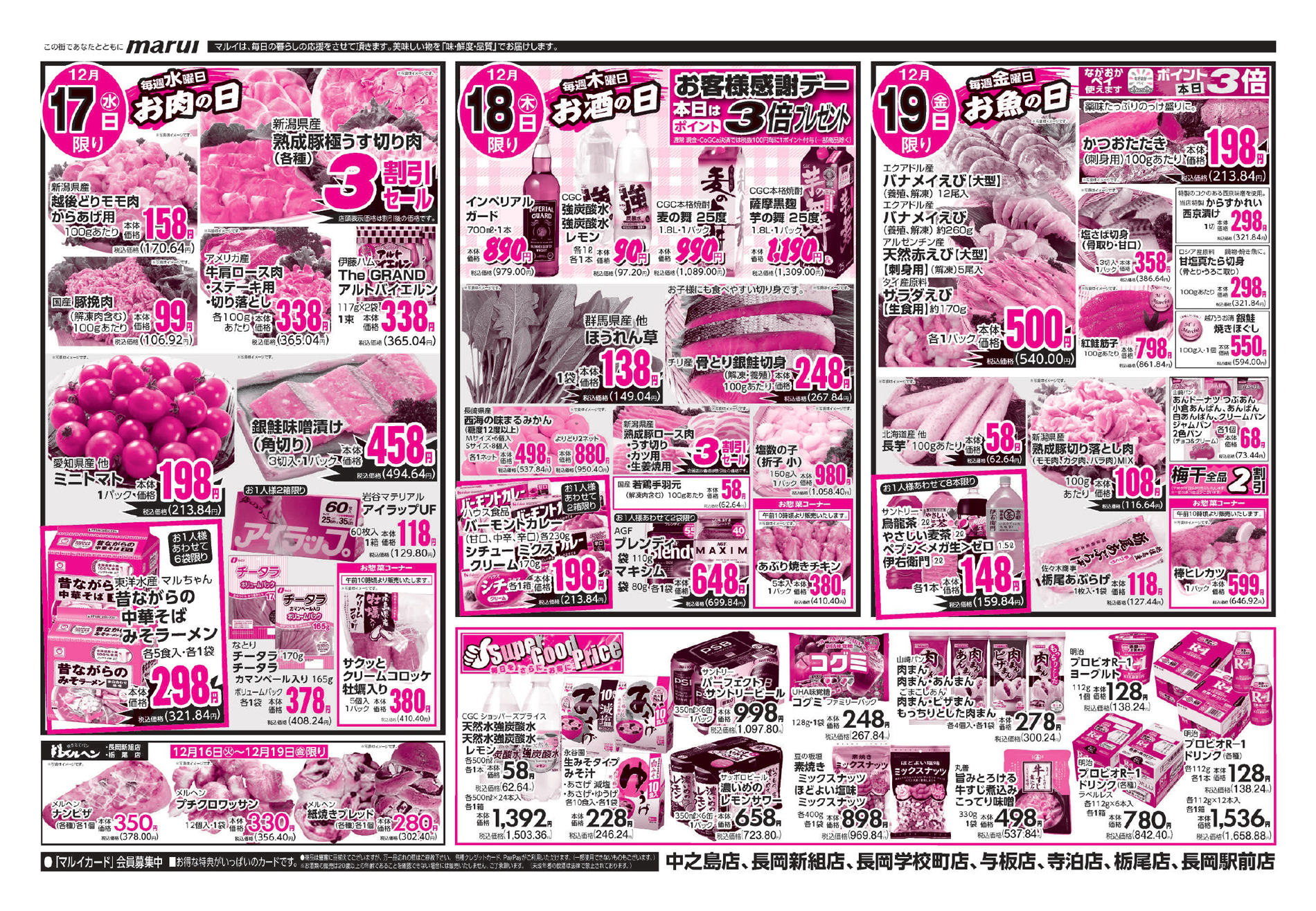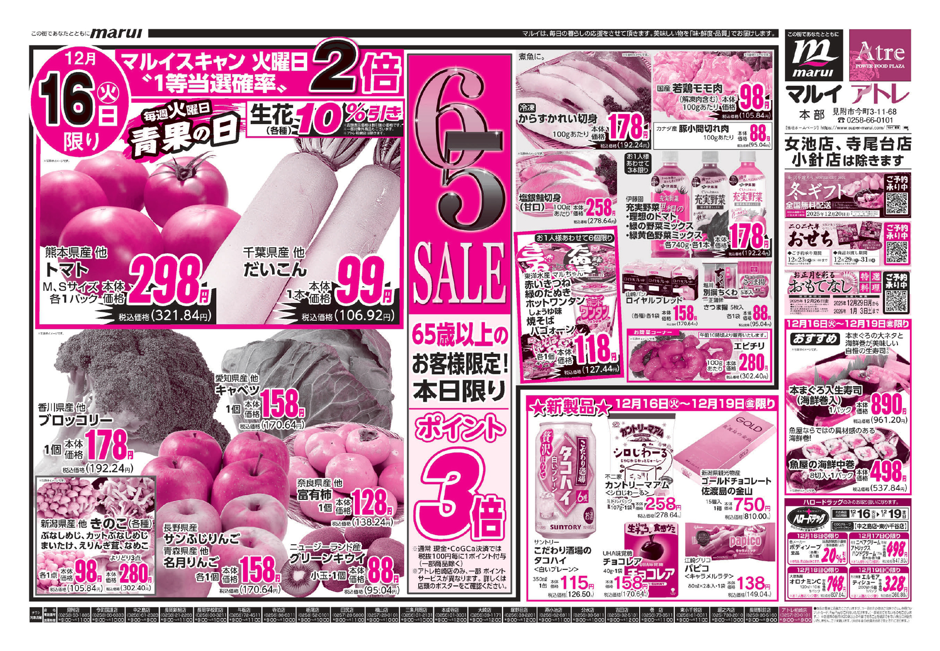 株式会社マルイ 【マルイチラシ】65SALE 掲載期間:2025年12月16日〜2025年12月19日 中越新潟市下越 スーパーマルイ 目次 各店 中之島店・長岡新組店・長岡学校町店・与板店・寺泊店・栃尾店・長岡駅前店 各店 画像をクリックして拡大 prev next 中之島店・長岡新組店・長岡学校町店・与板店・寺泊店・栃尾店・長岡駅前店 画像をクリックして拡大 prev next セール・新店情報を見逃さない! ガタチラをホーム画面に追加して、 最新情報をすぐチェック▶追加方法はかんたん♪ 関連 65歳以上はポイント3倍らて!
