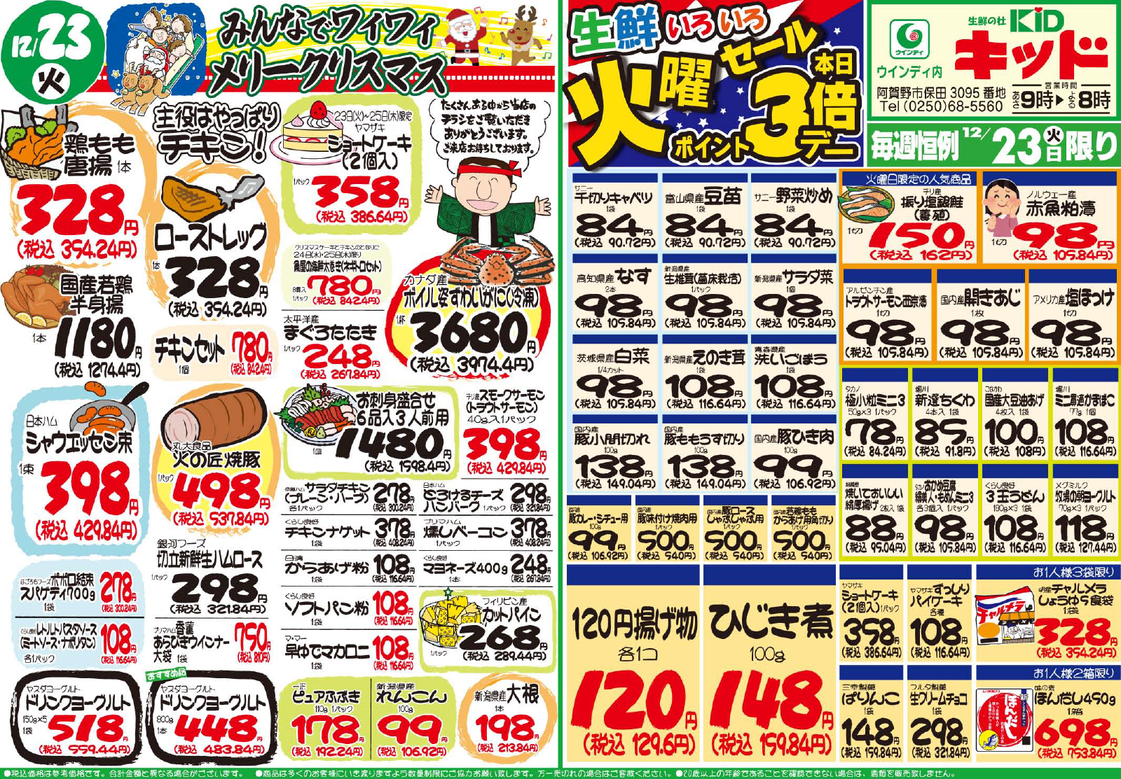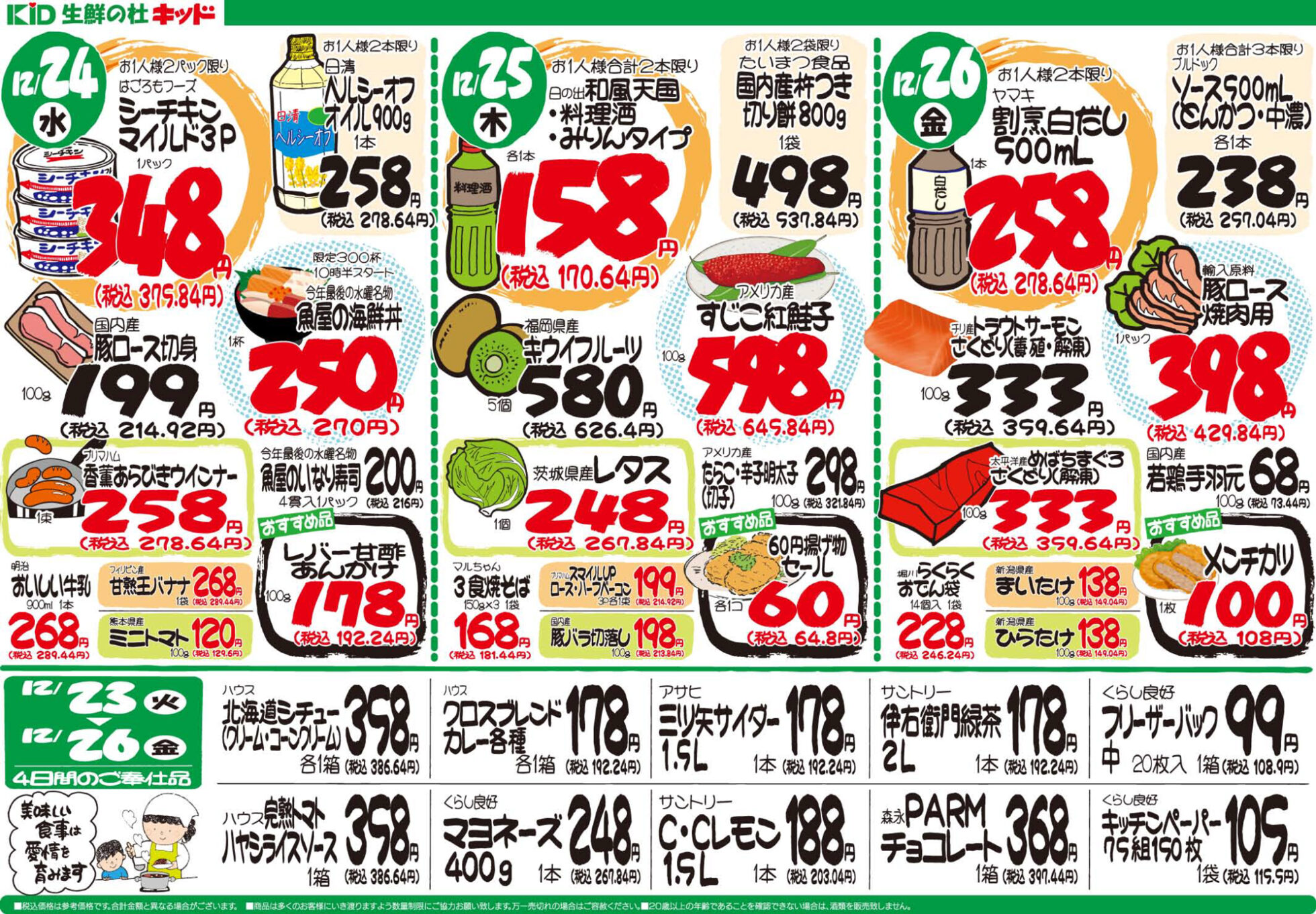キッド 【生鮮の杜キッドチラシ】みんなでワイワイ メリークリスマス 掲載期間:2025年12月23日〜2025年12月26日 下越 スーパー 画像をクリックして拡大 prev next セール・新店情報を見逃さない! ガタチラをホーム画面に追加して、 最新情報をすぐチェック▶追加方法はかんたん♪ 関連 唐揚げもローストレッグも食べたいわ~♪