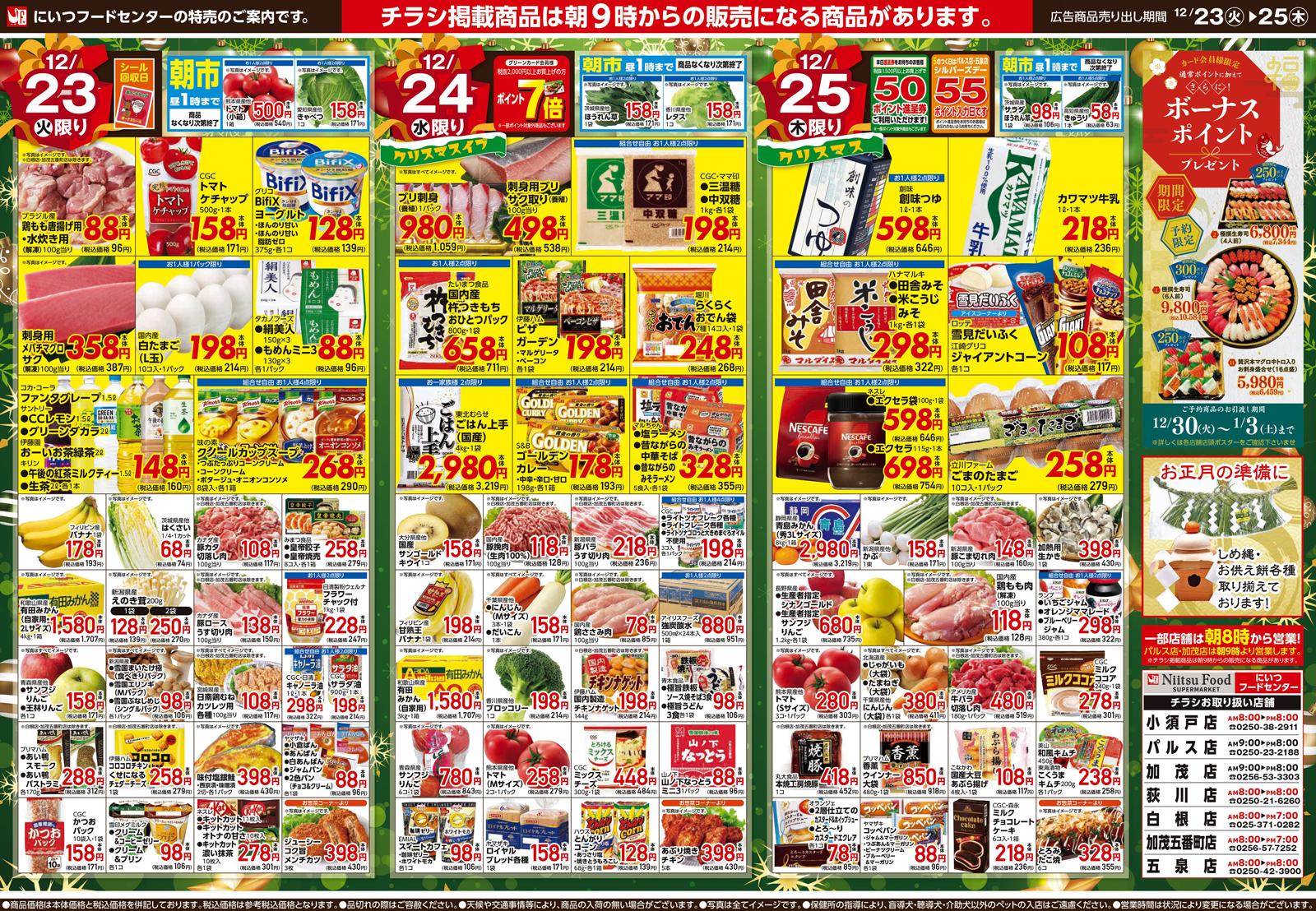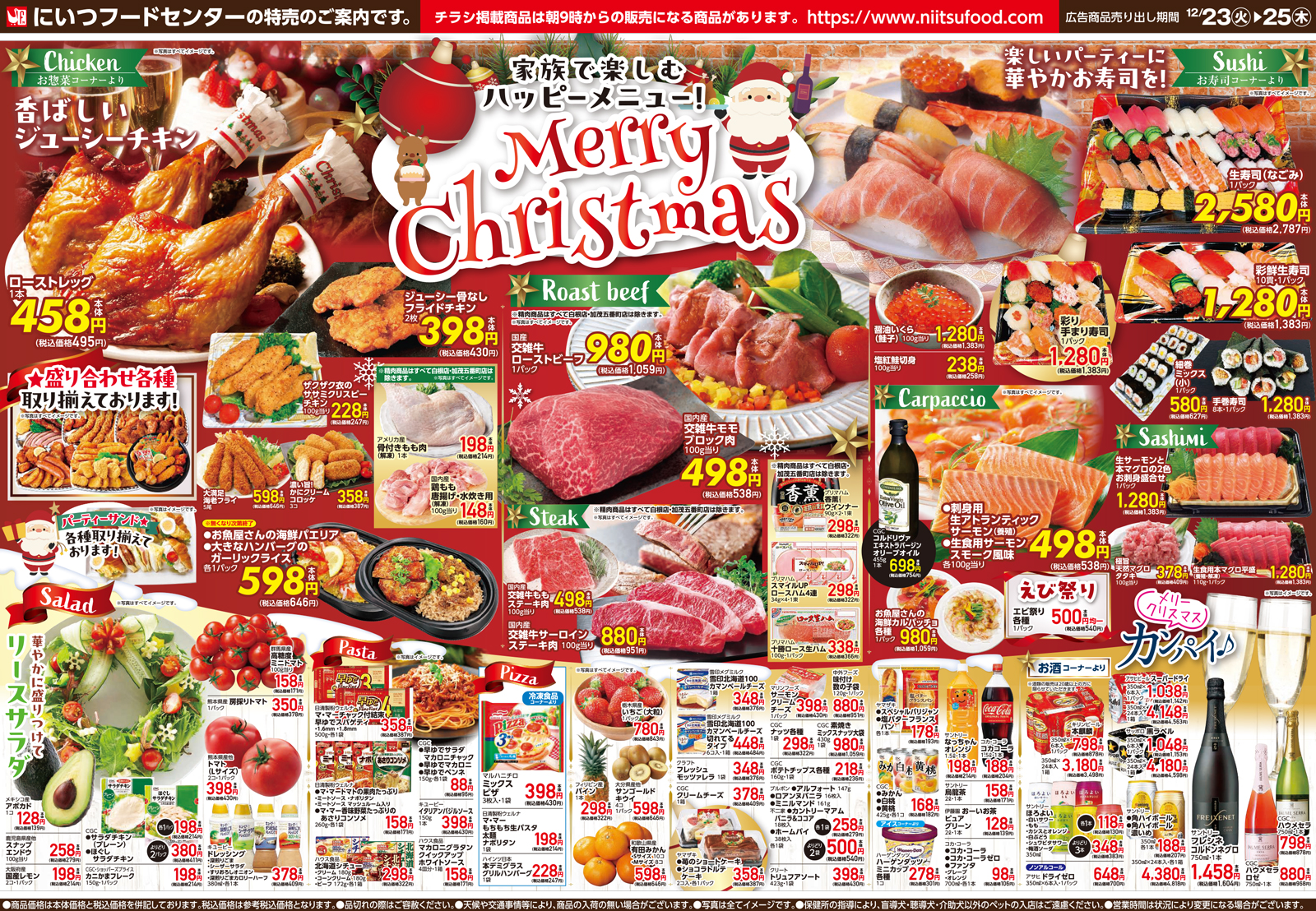 にいつフードセンター 【にいつフードセンターチラシ】家族で楽しむハッピーメニュー!Merry Christmas 掲載期間:2025年12月23日〜2025年12月25日 中越新潟市下越 スーパーにいつフードセンター 画像をクリックして拡大 prev next セール・新店情報を見逃さない! ガタチラをホーム画面に追加して、 最新情報をすぐチェック▶追加方法はかんたん♪ 関連 チキンもお寿司も食べたいな~♪