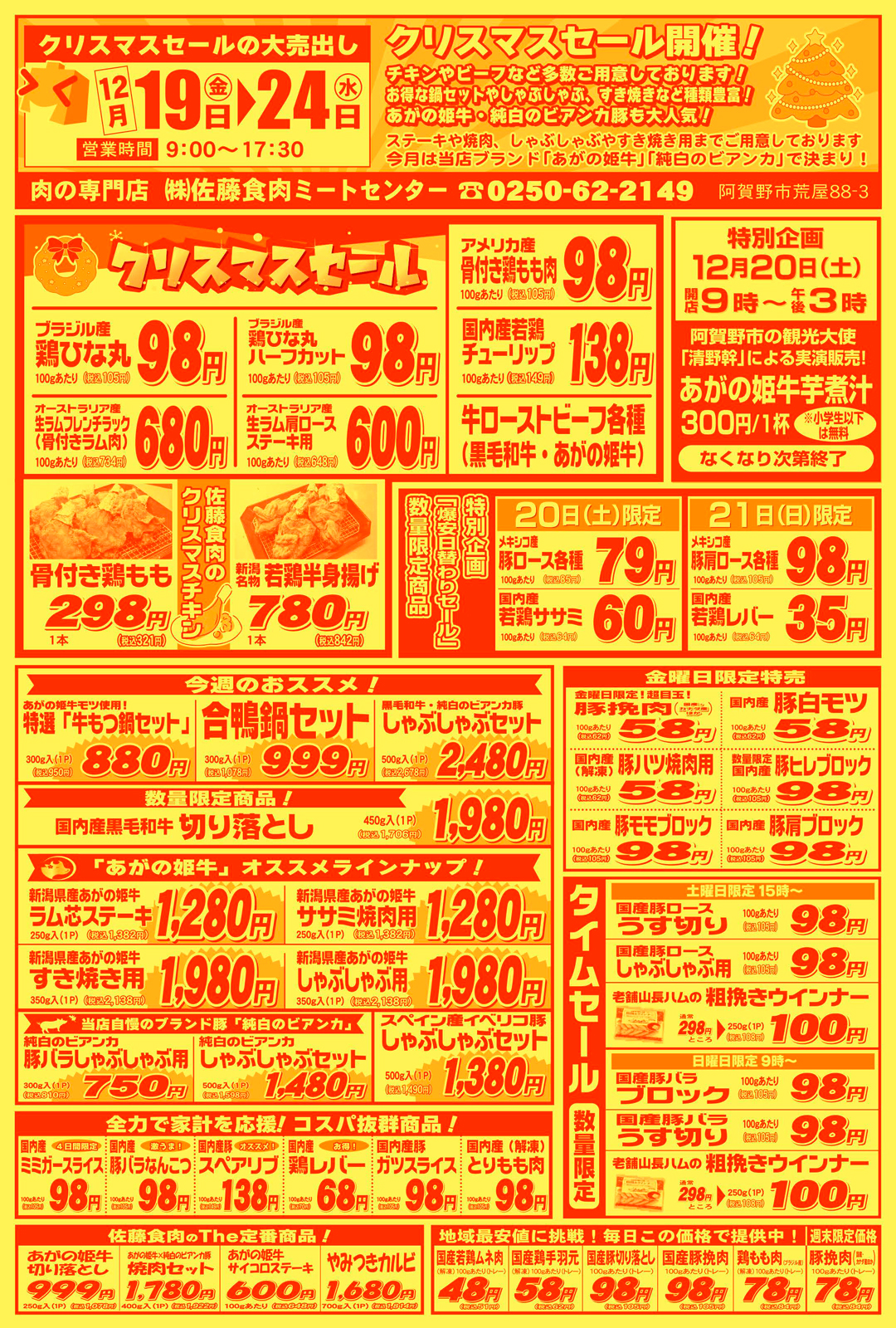 佐藤食肉 【佐藤食肉チラシ】クリスマスセール開催! 掲載期間:2025年12月19日〜2025年12月24日 新潟市下越 スーパー 画像をクリックして拡大 prev next セール・新店情報を見逃さない! ガタチラをホーム画面に追加して、 最新情報をすぐチェック▶追加方法はかんたん♪ 関連 「牛ローストビーフ」買っちゃおうかしら♪