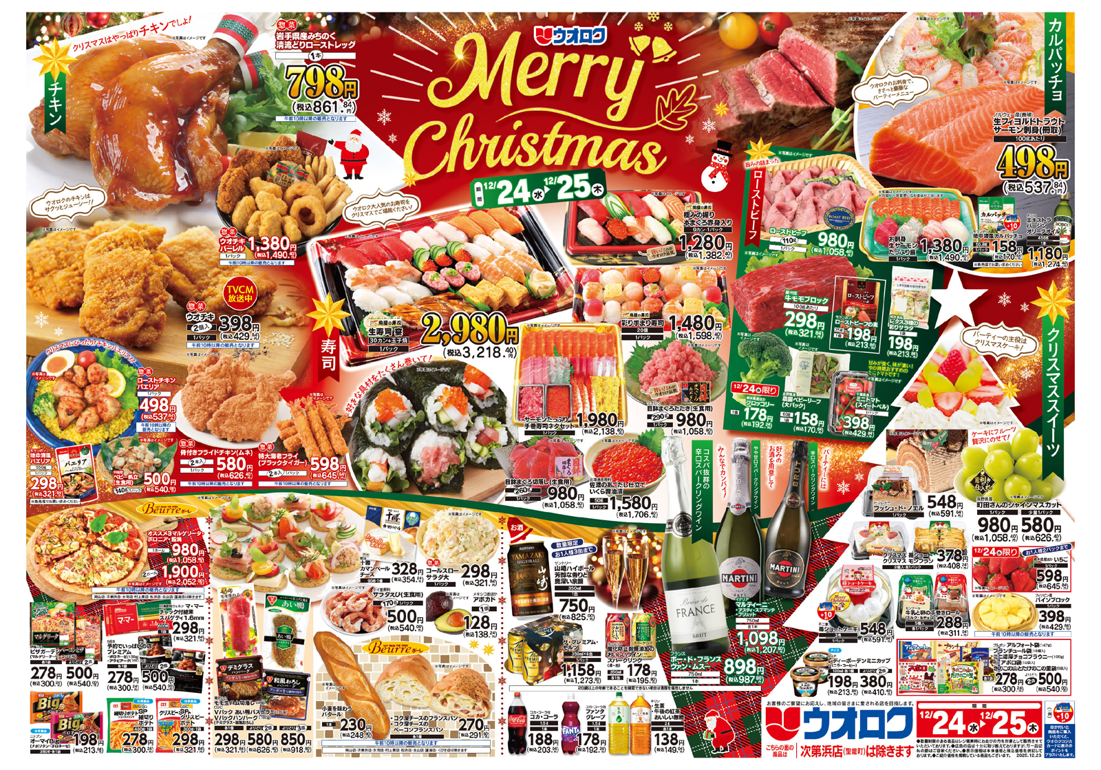 ウオロク 【ウオロクチラシ】Merry Christmas 掲載期間:2025年12月23日〜2025年12月25日 上越中越新潟市下越 スーパーウオロク 画像をクリックして拡大 prev next セール・新店情報を見逃さない! ガタチラをホーム画面に追加して、 最新情報をすぐチェック▶追加方法はかんたん♪ 関連 今年最後の98円均一も 必見ね♪