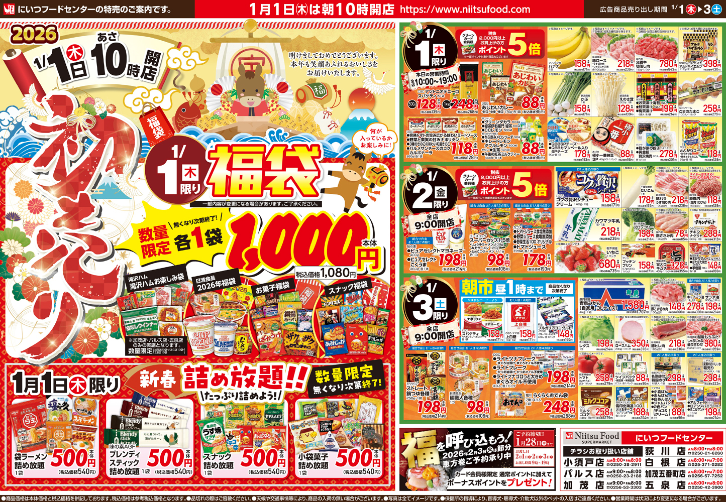 にいつフードセンター 【にいつフードセンターチラシ】初売り 掲載期間:2026年1月1日〜2026年1月3日 中越新潟市下越 スーパーにいつフードセンター 画像をクリックして拡大 prev next セール・新店情報を見逃さない! ガタチラをホーム画面に追加して、 最新情報をすぐチェック▶追加方法はかんたん♪ 関連 福袋や詰め放題のイベントがあるわよ! 今年の運試しに挑戦してみましょう!!