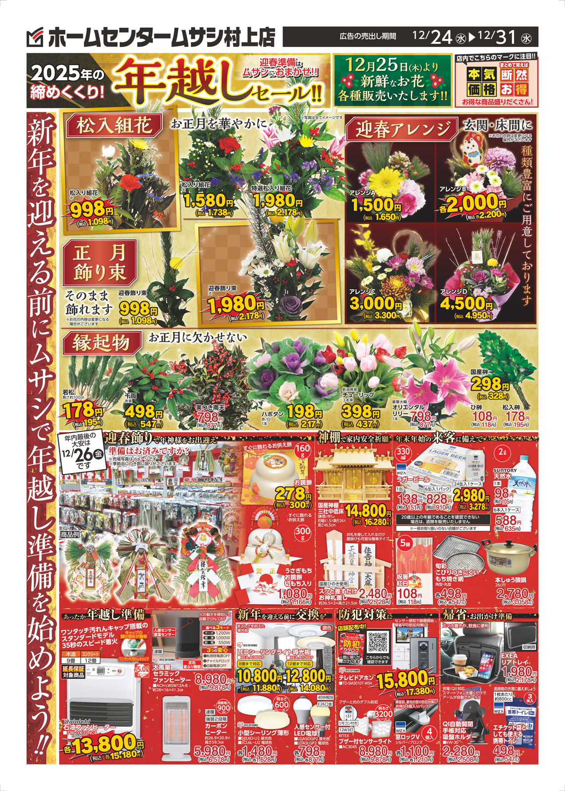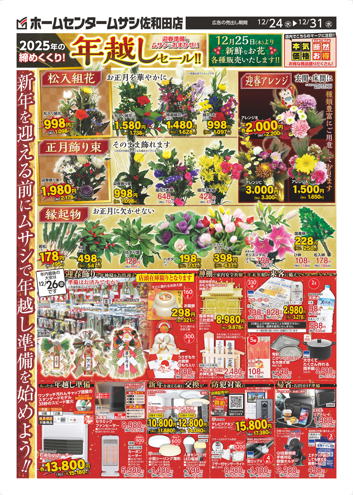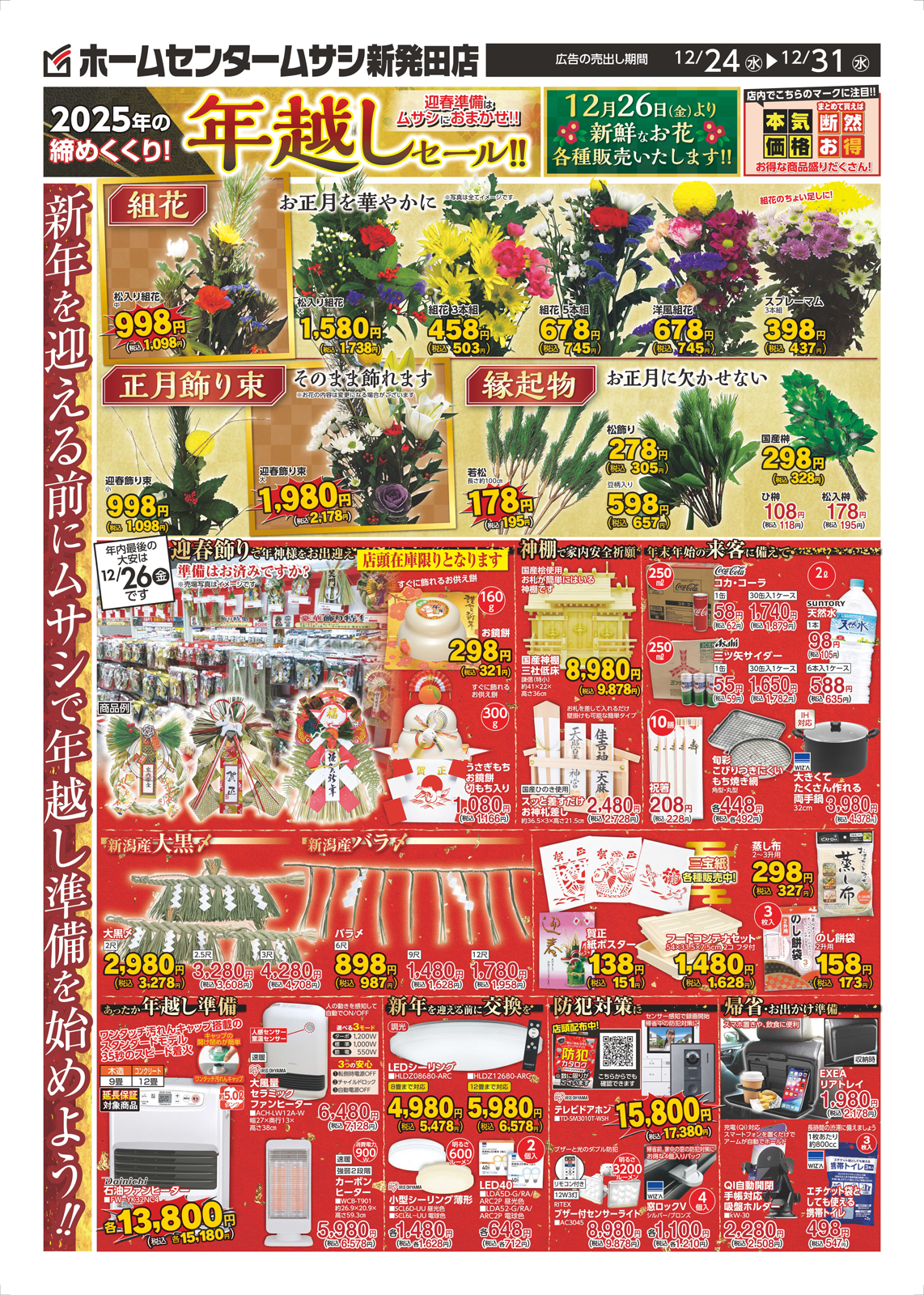 ホームセンタームサシ三条店・新発田店・村上店・佐和田店 【ホームセンタームサシ三条店・新発田店・村上店・佐和田店チラシ】年末準備号 掲載期間:2025年12月24日〜2025年12月31日 中越下越佐渡 ホームセンター 目次 三条店 新発田店 村上店 佐和田店 三条店 画像をクリックして拡大 prev next 新発田店 画像をクリックして拡大 prev next 村上店 画像をクリックして拡大 prev next 佐和田店 画像をクリックして拡大 prev next セール・新店情報を見逃さない! ガタチラをホーム画面に追加して、 最新情報をすぐチェック▶追加方法はかんたん♪ 関連 お正月飾りのアレンジフラワーは可愛くて、狭いスペースにも飾れるわね!