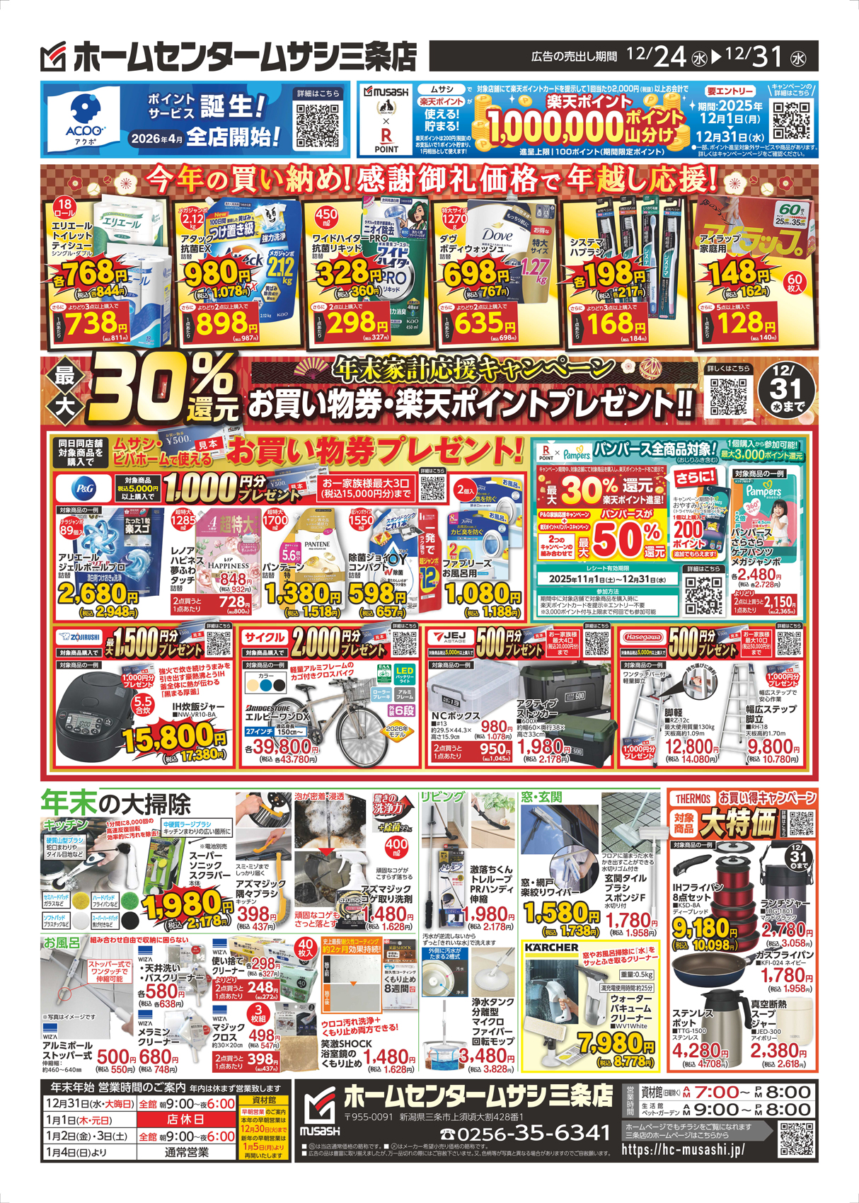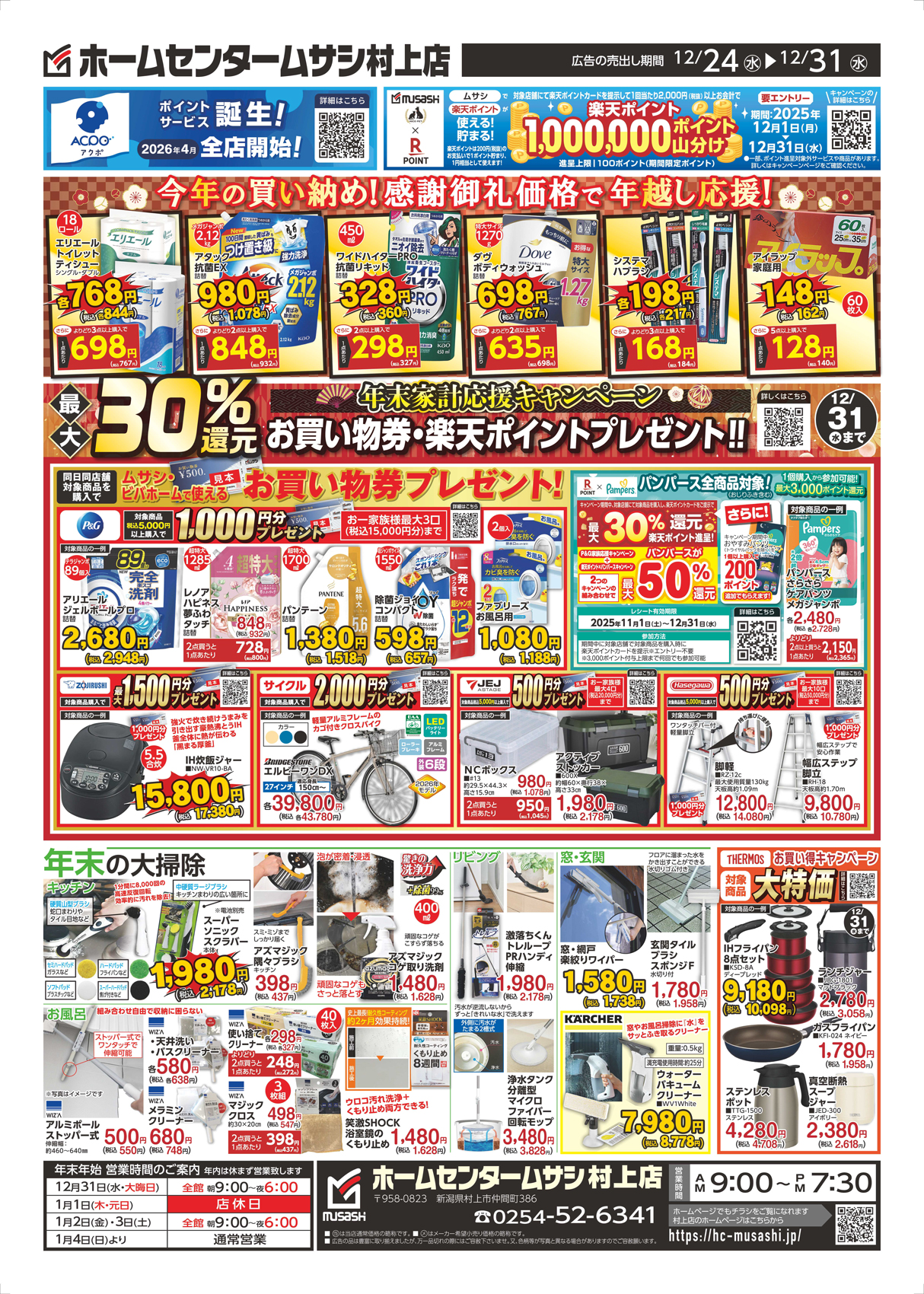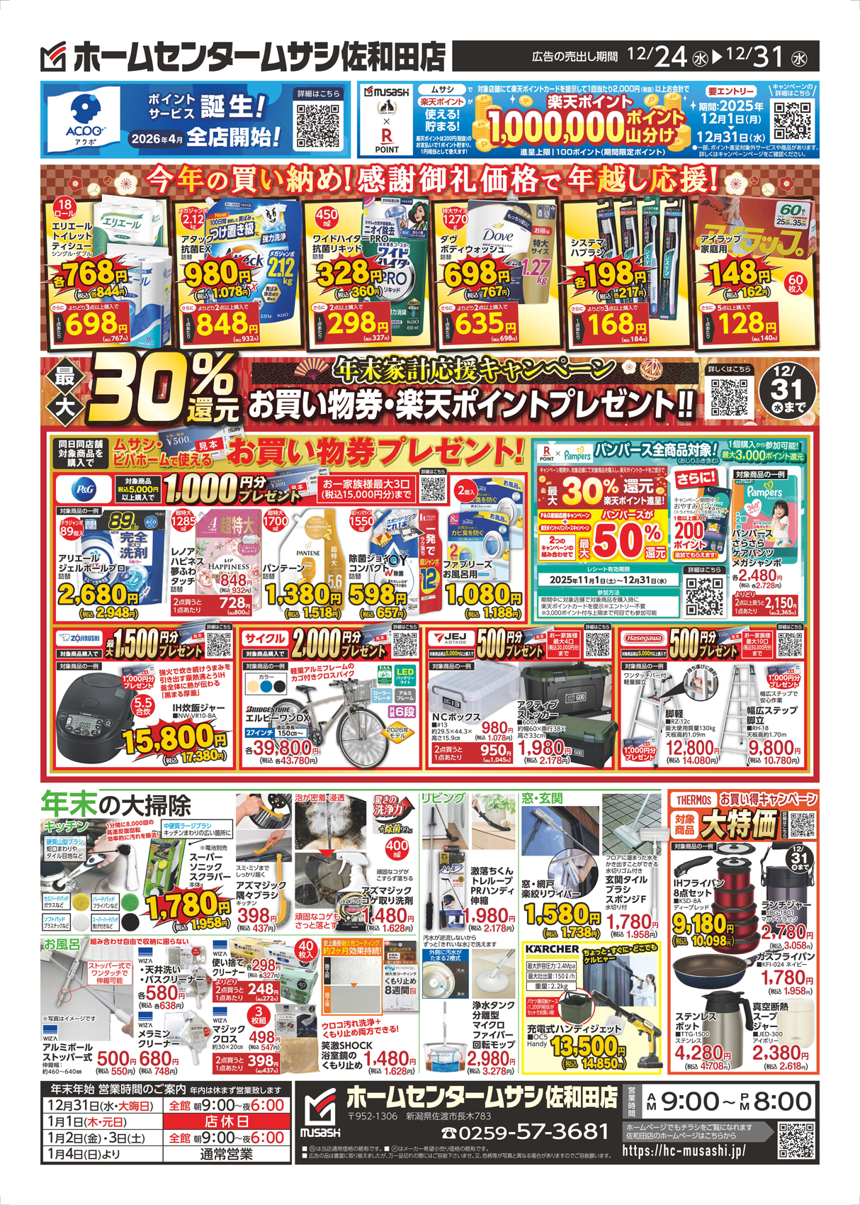 ホームセンタームサシ三条店・新発田店・村上店・佐和田店 【ホームセンタームサシ三条店・新発田店・村上店・佐和田店チラシ】年末準備号 掲載期間:2025年12月24日〜2025年12月31日 中越下越佐渡 ホームセンター 目次 三条店 新発田店 村上店 佐和田店 三条店 画像をクリックして拡大 prev next 新発田店 画像をクリックして拡大 prev next 村上店 画像をクリックして拡大 prev next 佐和田店 画像をクリックして拡大 prev next セール・新店情報を見逃さない! ガタチラをホーム画面に追加して、 最新情報をすぐチェック▶追加方法はかんたん♪ 関連 お正月飾りのアレンジフラワーは可愛くて、狭いスペースにも飾れるわね!