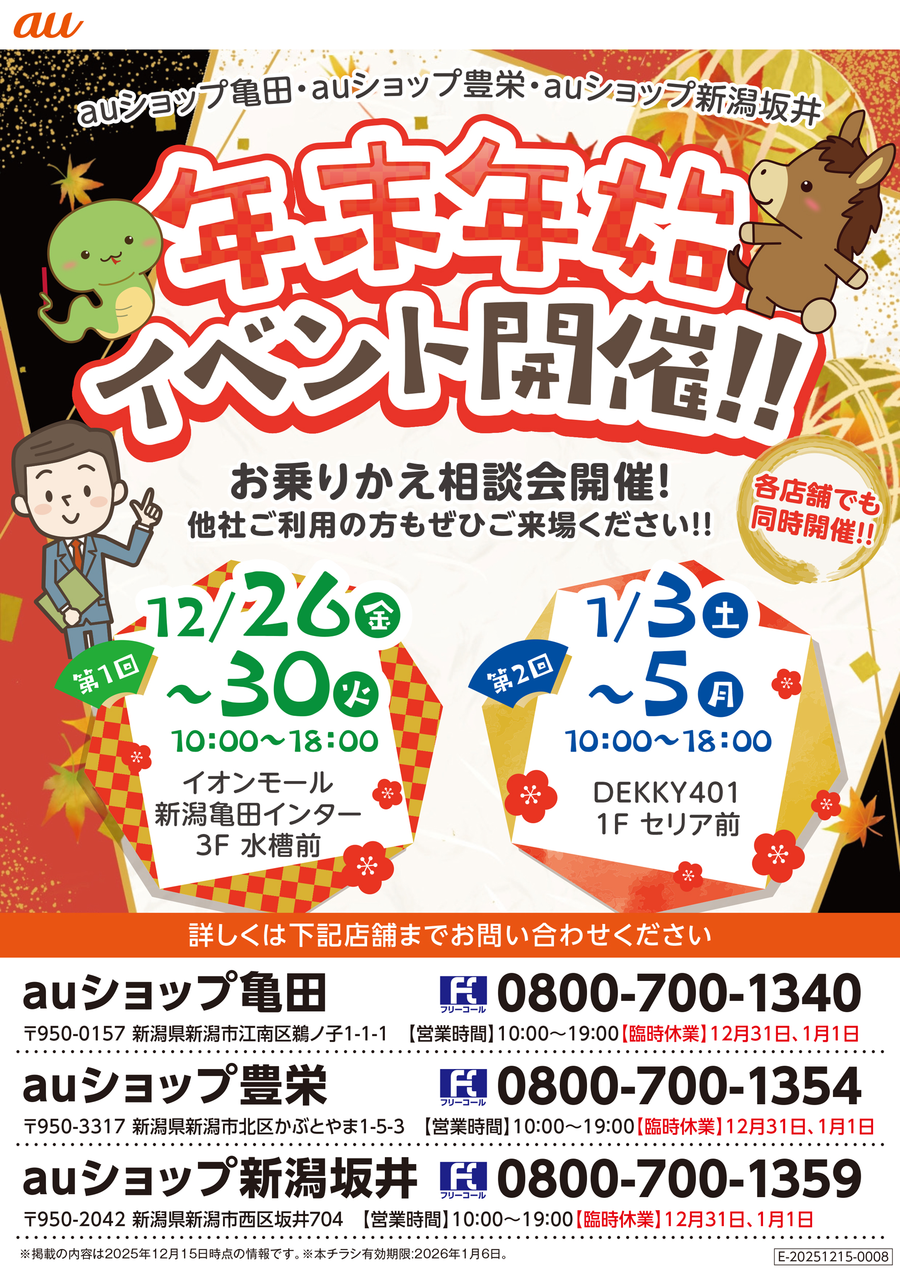 TOP > チラシ情報 > 家電・携帯電話 > 【auショップ亀田チラシ】年末年始イベント開催