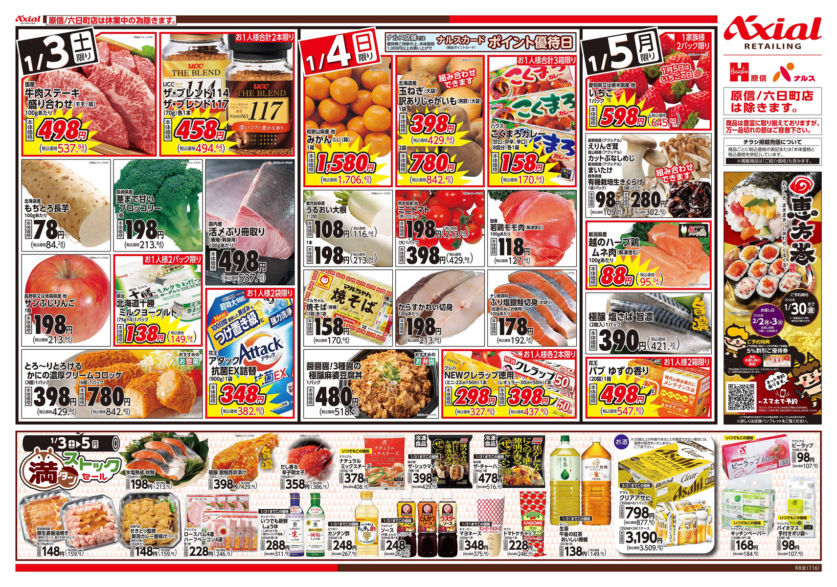 原信ナルス 【原信ナルスチラシ】新春パーティー 掲載期間:2026年1月3日〜2026年1月5日 上越中越新潟市下越 スーパー原信ナルス 画像をクリックして拡大 prev next 対象:全店(六日町店を除く) セール・新店情報を見逃さない! ガタチラをホーム画面に追加して、 最新情報をすぐチェック▶追加方法はかんたん♪ 関連 煌めき海鮮太巻、おいしそう!