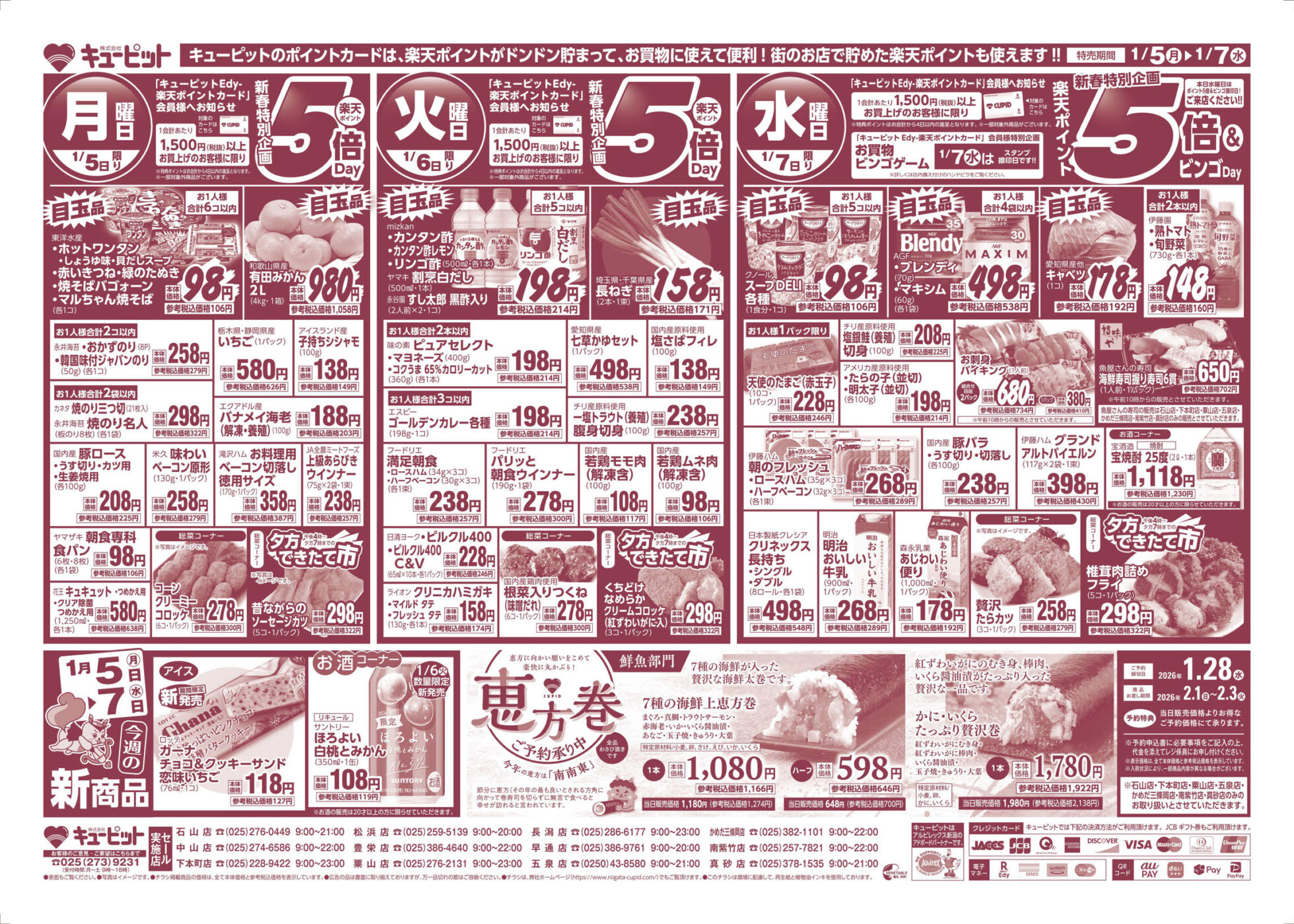 キューピット 【キューピットチラシ】SUPERゾロ目市 掲載期間:2026年1月5日〜2026年1月7日 新潟市下越 スーパーキューピット 画像をクリックして拡大 prev next セール・新店情報を見逃さない! ガタチラをホーム画面に追加して、 最新情報をすぐチェック▶追加方法はかんたん♪ 関連 いろいろお得で買い過ぎちゃいそうね!しっかりチェックしてお買い物しましょ♪