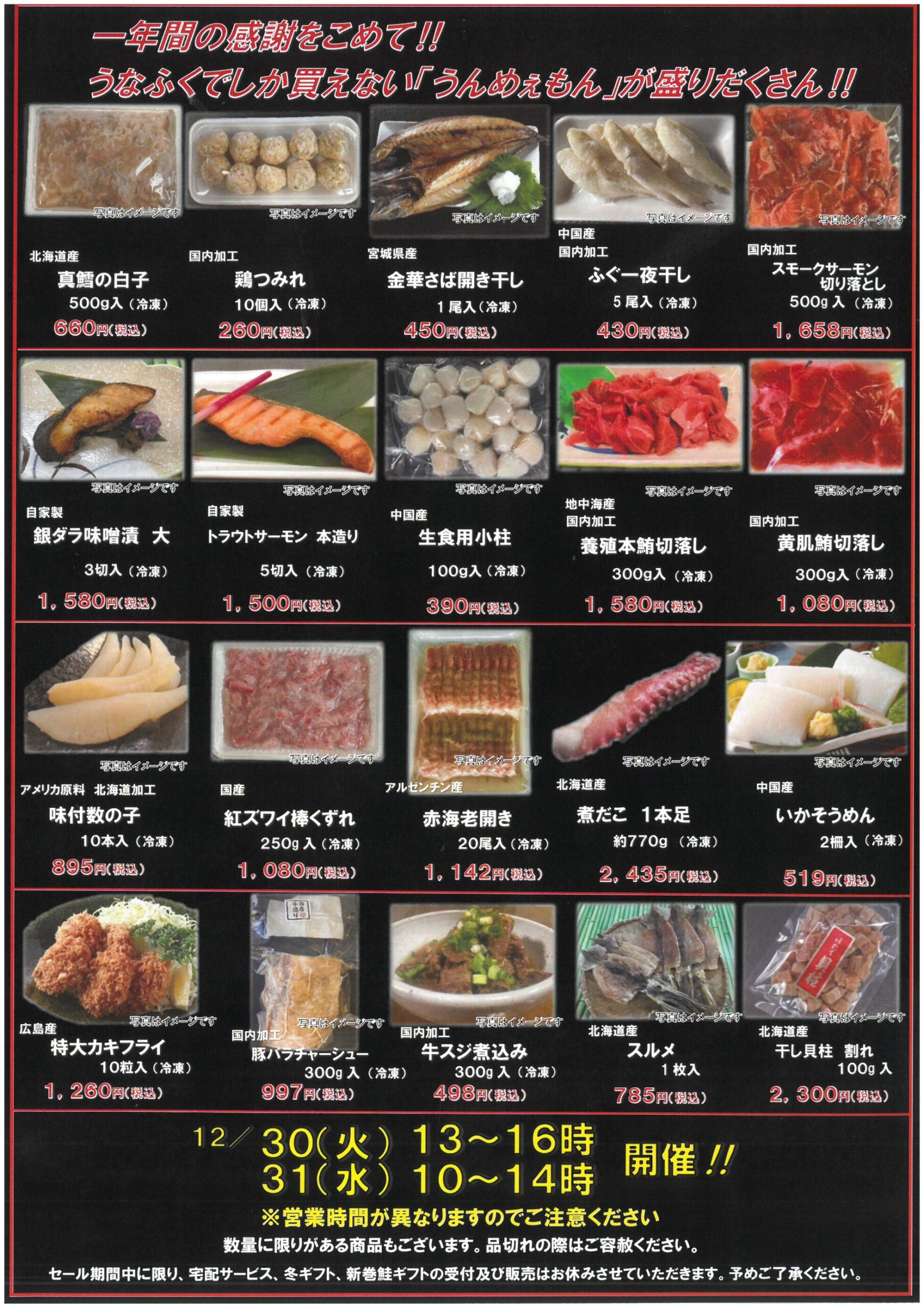 越後魚屋うなふく 【越後魚屋うなふくチラシ】歳末ビッグセール 掲載期間:2025年12月29日〜2025年12月31日 中越 グルメ 画像をクリックして拡大 prev next セール・新店情報を見逃さない! ガタチラをホーム画面に追加して、 最新情報をすぐチェック▶追加方法はかんたん♪ 関連 数量限定ですって! 早めに買いに行かなきゃ!!