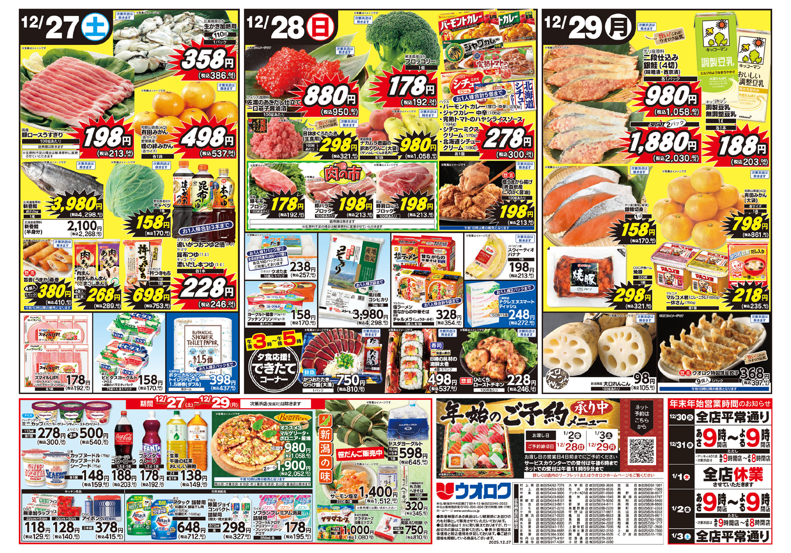 ウオロク 【ウオロクチラシ】歳末大市 掲載期間:2025年12月27日〜2025年12月29日 上越中越新潟市下越 スーパーウオロク 画像をクリックして拡大 prev next セール・新店情報を見逃さない! ガタチラをホーム画面に追加して、 最新情報をすぐチェック▶追加方法はかんたん♪ 関連 年末は家族でお鍋をつつきながら、おいしいお酒が飲みたいなぁ!